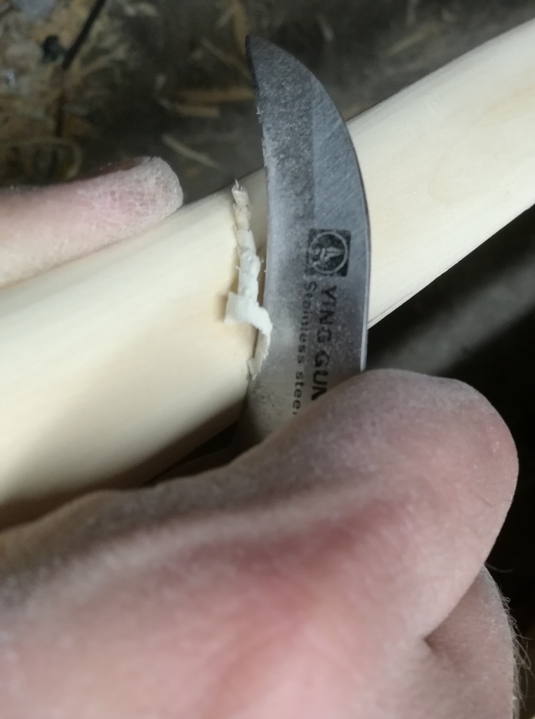 So.. Nun zurück zu meinem Spaltung Opfer. Habe im Bodentiller die Wurfarme nochmals geprüft bis auf den bisher sehr großzügig behalten steifen Bereich im Griff arbeiten die Arme schon mal gut der untere Wurfarm war aber noch etwas zu stark. Also kurzerhand mit dem Katoffelmesser (das kleine mit der gebogenen Klinge) noch ein wenig geschaut. Nun habe ich mittels provisorische Wickelnocken meine Tillersehne locker aufgespannt. Und vorsichtig gezogen. Wie ich es befürchtet habe kippt der Bogen seitlich weg und der obere (seitlich gebogene) Wurfarm verdreht sich leicht. Um dieses durch tillern zu kompensieren müsste ich, ausgerechnet an dem schon beim Spalten endstandenen schwachen Wurfarmanfang seitlich etwas wegnehmen und den Bogen weiter schwächen. Nagut dann halt Plan B und kürzen. Wickelnocken ca 10cm tiefer angebracht und nochmals probiert. Nun dreht der Bogen nicht mehr weg oder verdreht sich und die Sehne läuft sauber durch die Bogen mitte.