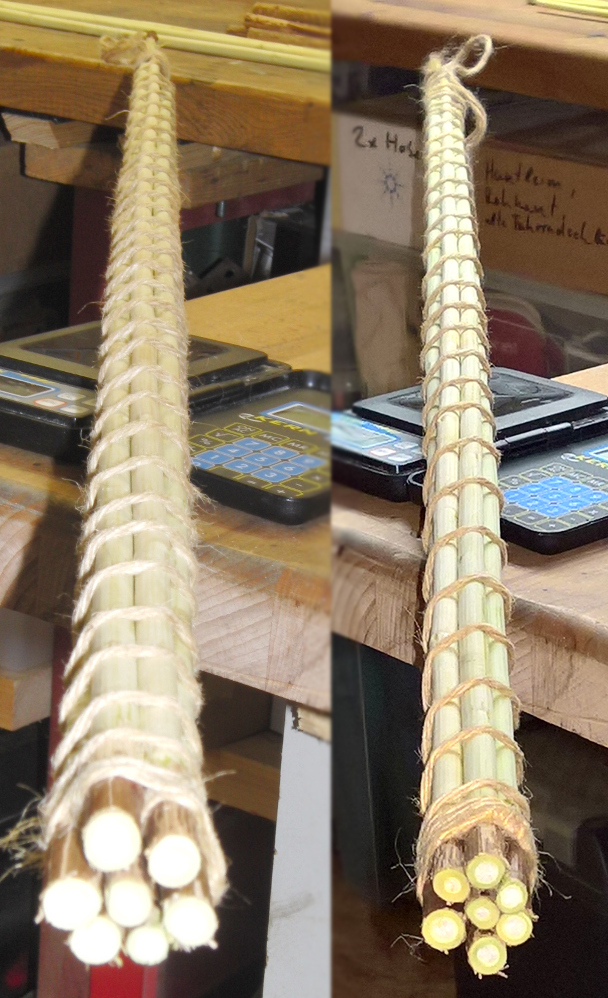 Die am 12.01. geernteten Pfeilschäfte haben in 14 Tagen bei 7 - 10°C und 50 - 65 % r.F. Ein knappes Viertel ihres ursprünglichen Gewichts verloren. Das wären 66,5 g Wasser. Gegen Ende der Phase haben die Schäfte noch 1 g Wasser in 12 h verloren und sind ins Haus bei 18 - 20°C und 40 - 50 % r.F. umgezogen und haben dort in ca. 18 h 7 g Feuchte verloren. Während der ersten Trockenzeit hat ein Schaft an einem Auge einen sichtbaren Trockenriss gezeigt und ist somit wohl aus dem Rennen.