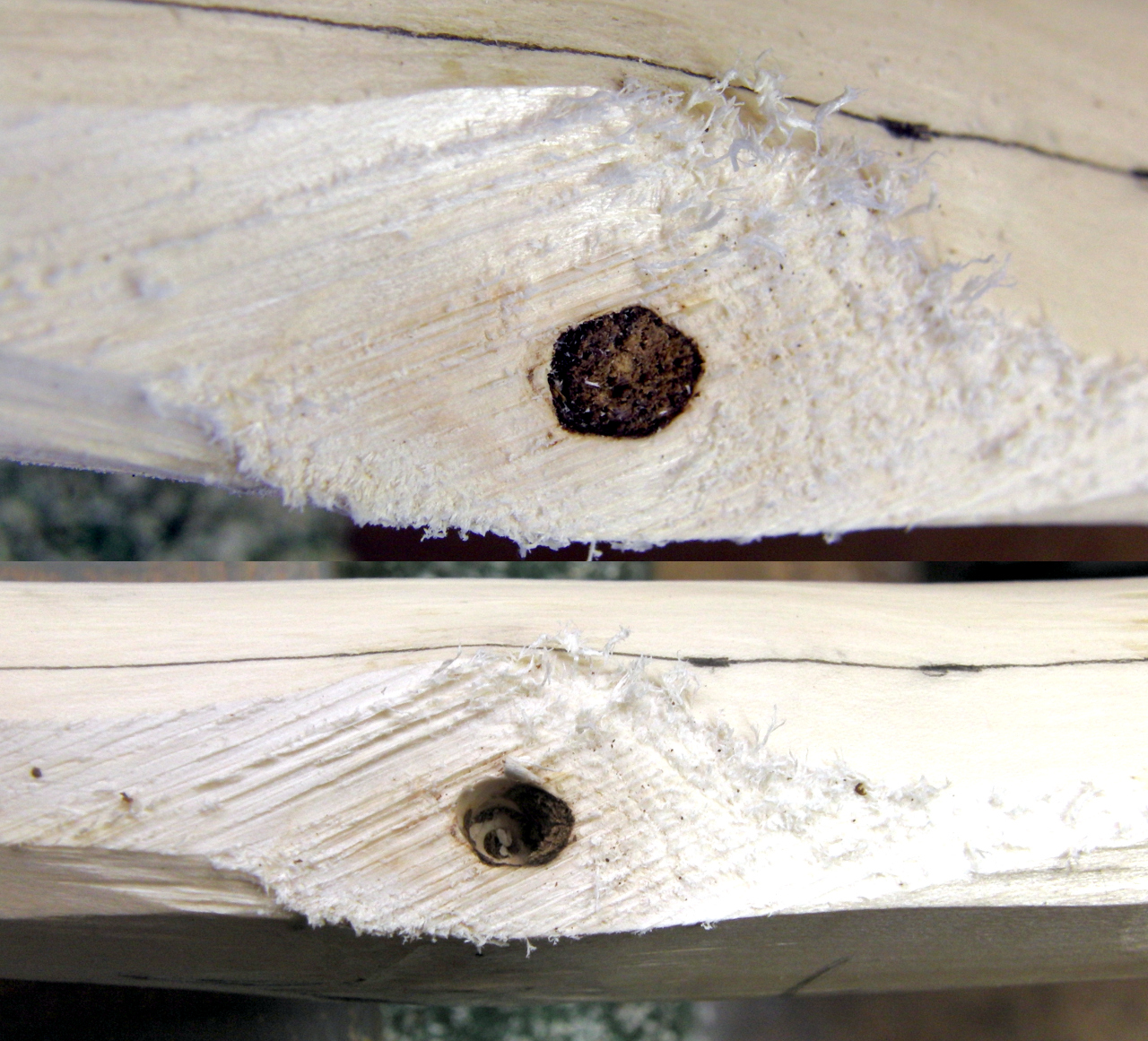 Der Rohling hat in jedem Wurfarm einen ungünstig gelegenen Totast im Biegebereich. Im weiteren Verlauf werde ich diesen wohl mit einem hierauf dressierten großen nachtaktiven Waldvogel auf den Pelz rücken