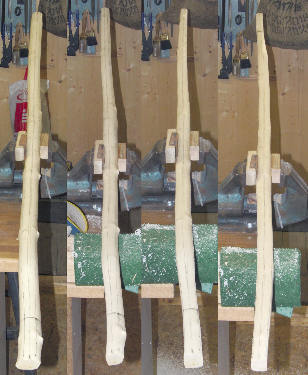 Gestern Abend habe ich es wieder in die Werkstatt geschafft und mit Schraubstock, flexiblem Stahllineal, 4B Bleistift und Radiergummi den Breitenverlauf des Bogens markiert.