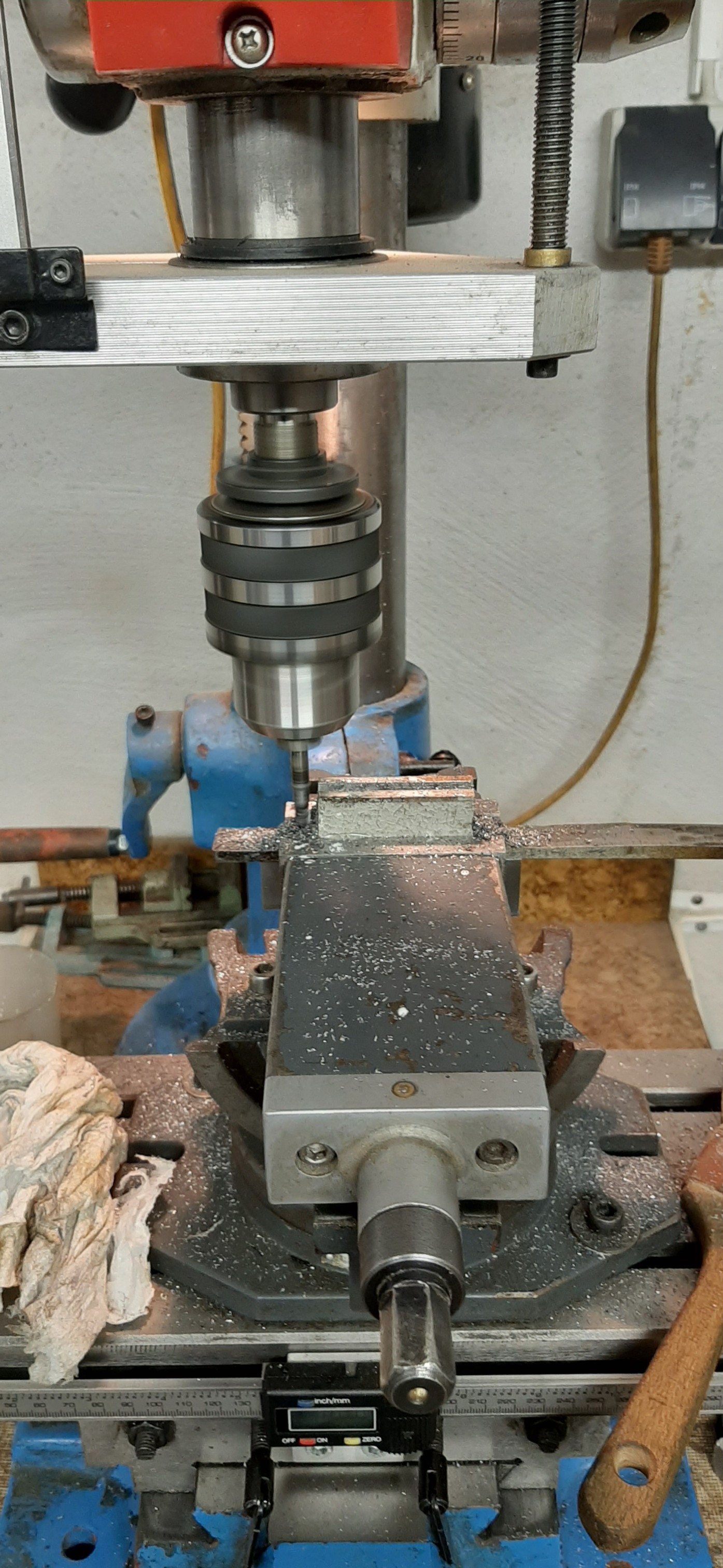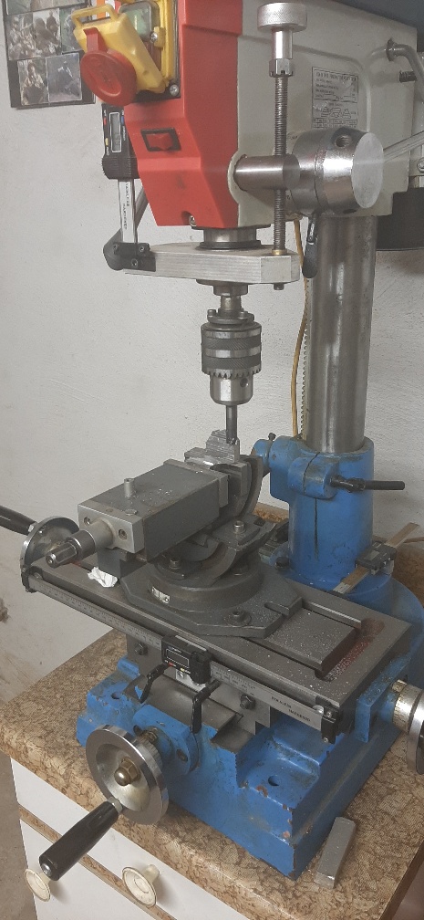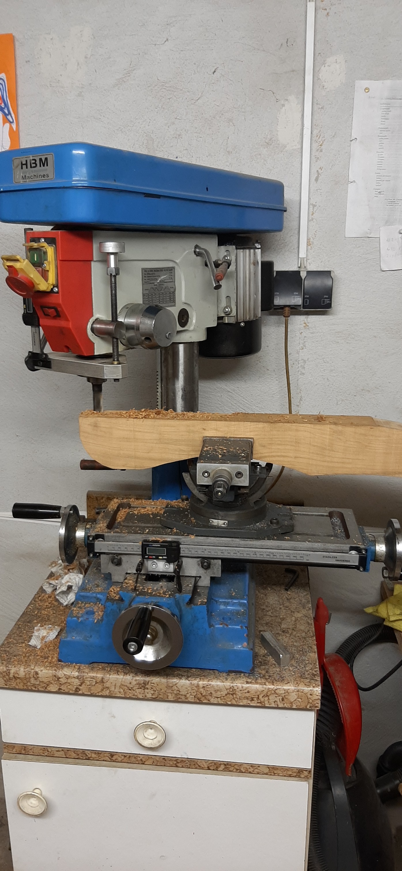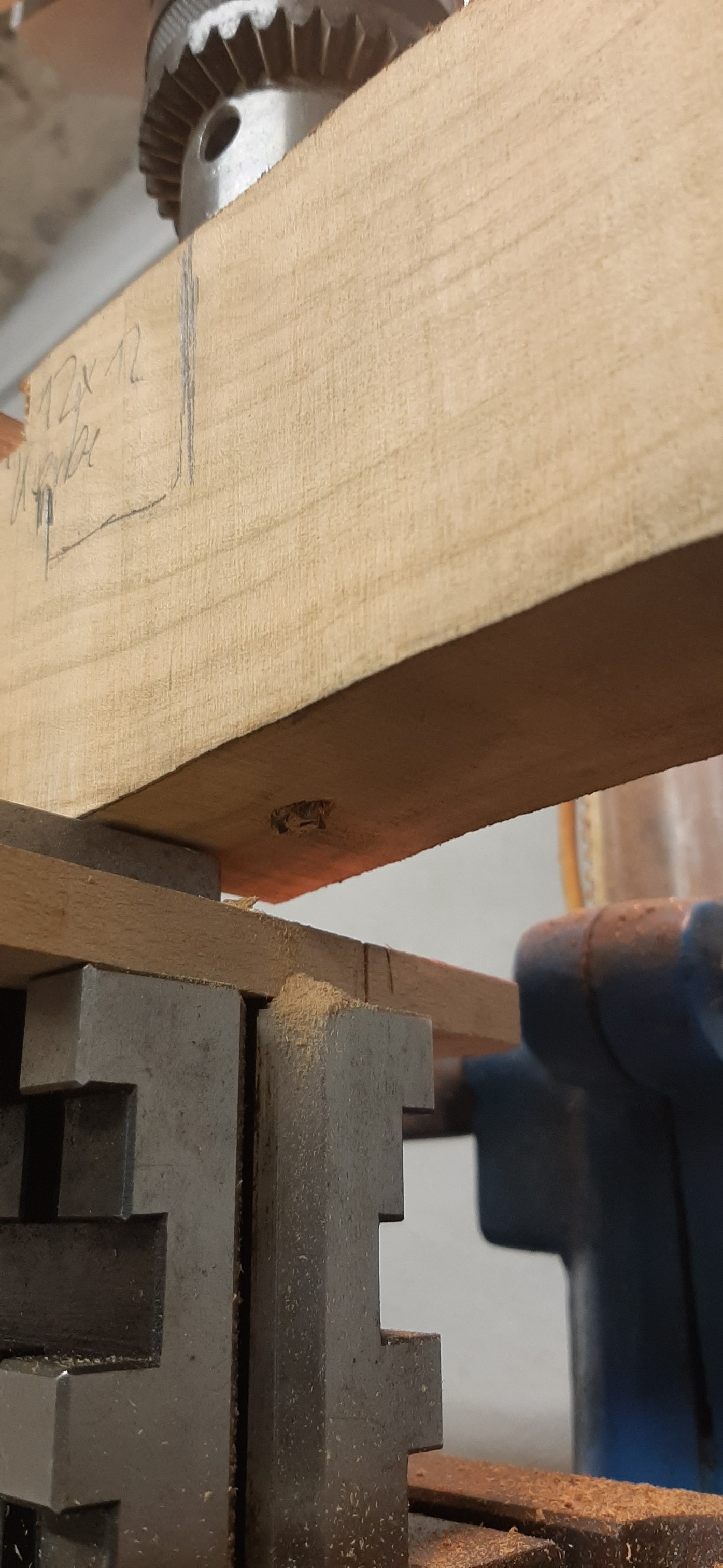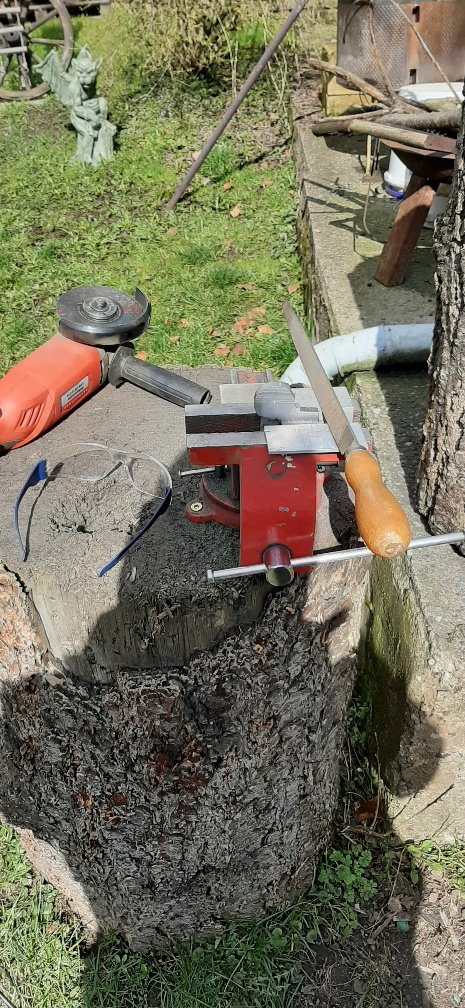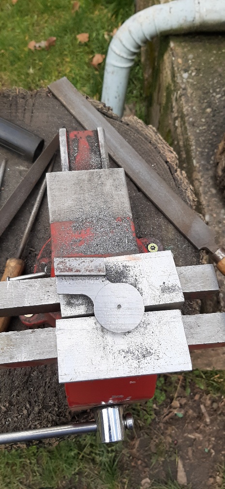Das Holz für die Säule hab ich noch nicht da. Aber deswegen kann ich ja schon andere Teile verfertigen. Damit ich nicht so viel fräsen muss habe ich erst mal geflext. Bei dem schönen Wetter ist ein Schraubstock draußen von Vorteil