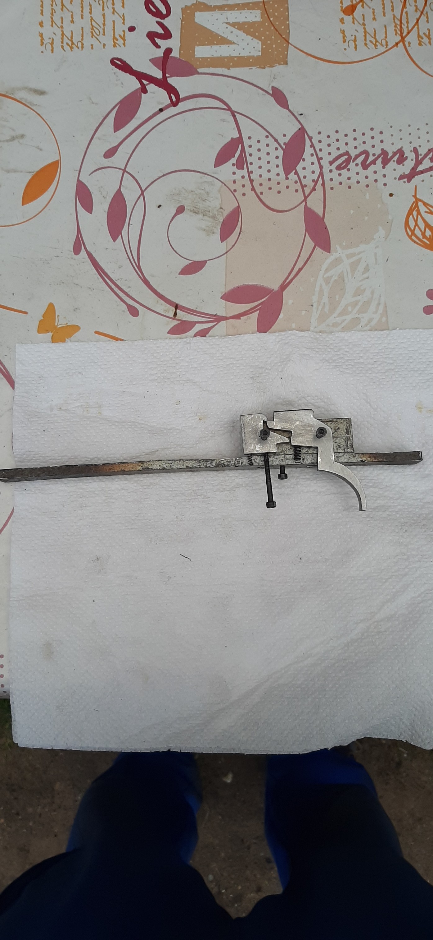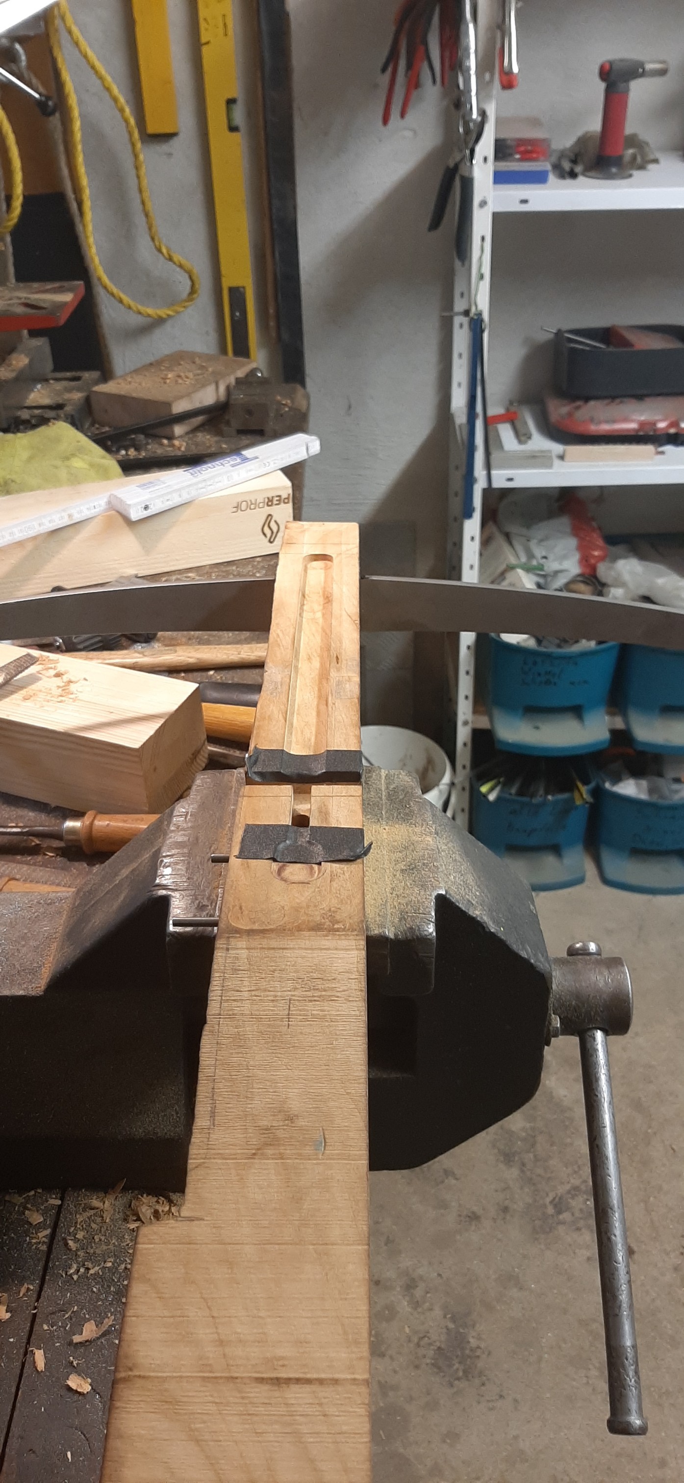 Die Haltefeder ist aus einem alten Sägeblatt. Diesmal ist sie in der Mitte offen damit sie beim Zielen nicht im Weg ist. Muss dann noch angepasst werden. Mein Biegeklotz für den Bügel konnte ich wieder verwenden.