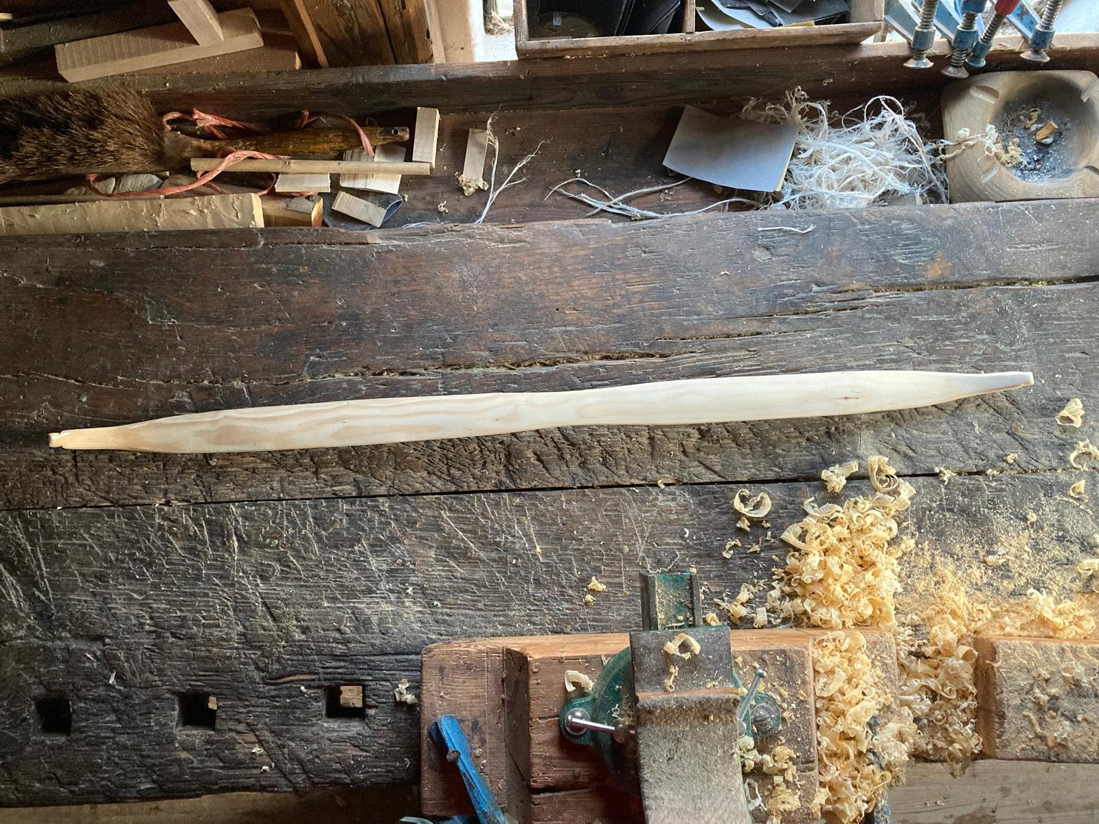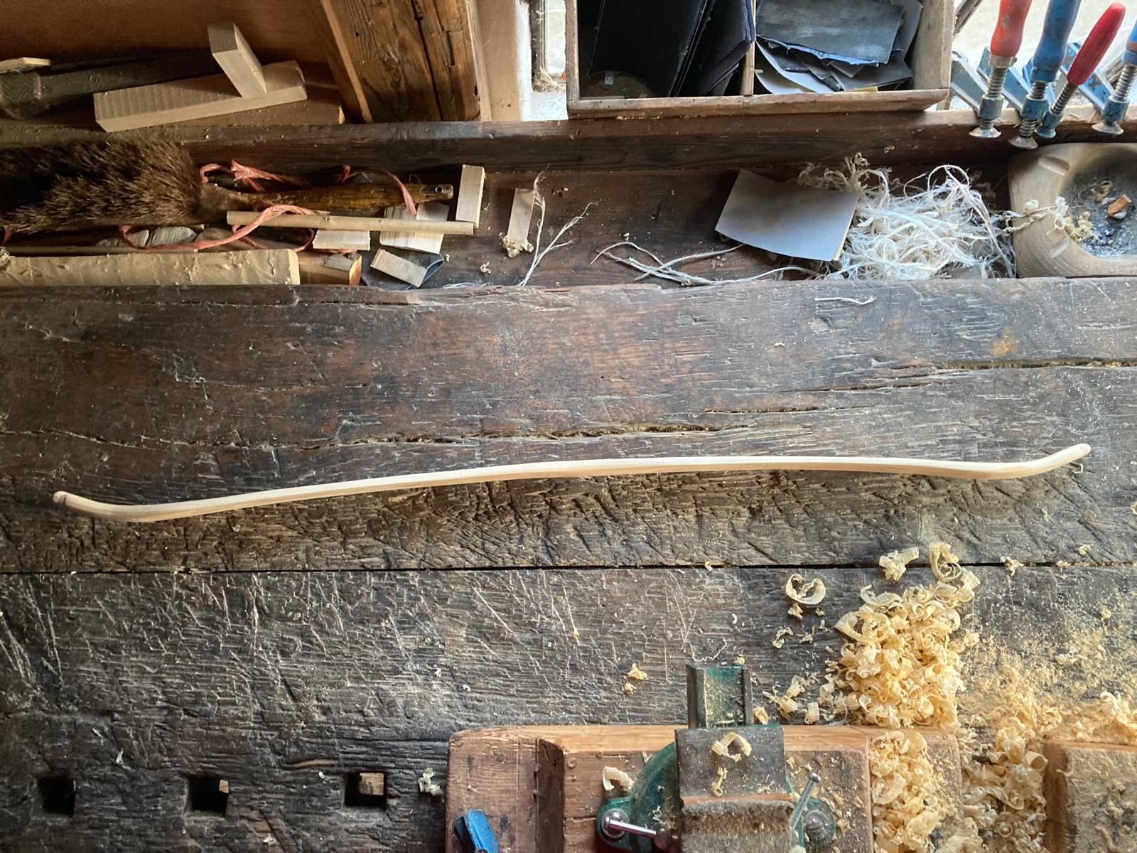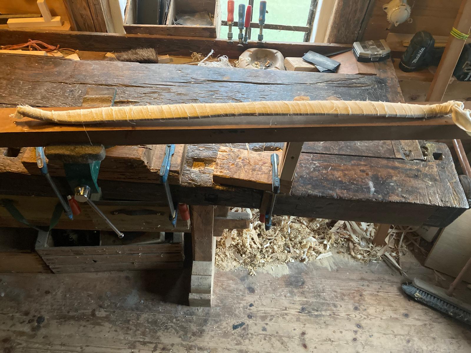 Der Bogen ist fertig vorbereitet für das Sehnenbacking. Die Dicke in WA Mitte beträgt mittlerweile 8 mm. Am Montag werden die Sehnen aufgebracht und nach der Trocknungszeit wird sich zeigen ob das Ding ein Bogen wird.