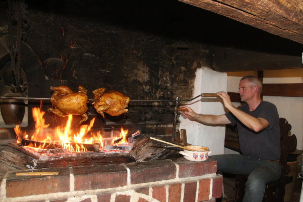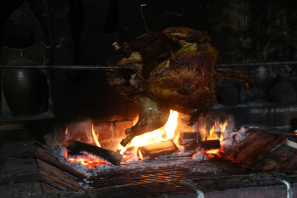 Zwei je 4 Kg Hühner verarztet und auf dem Spieß fixiert, dann schön gesalbt und in die Sonne gestellt zum Aufwärmen. Damit sie keinen Sonnenbrand bekommen werden sie von jedem ab und an gewendet