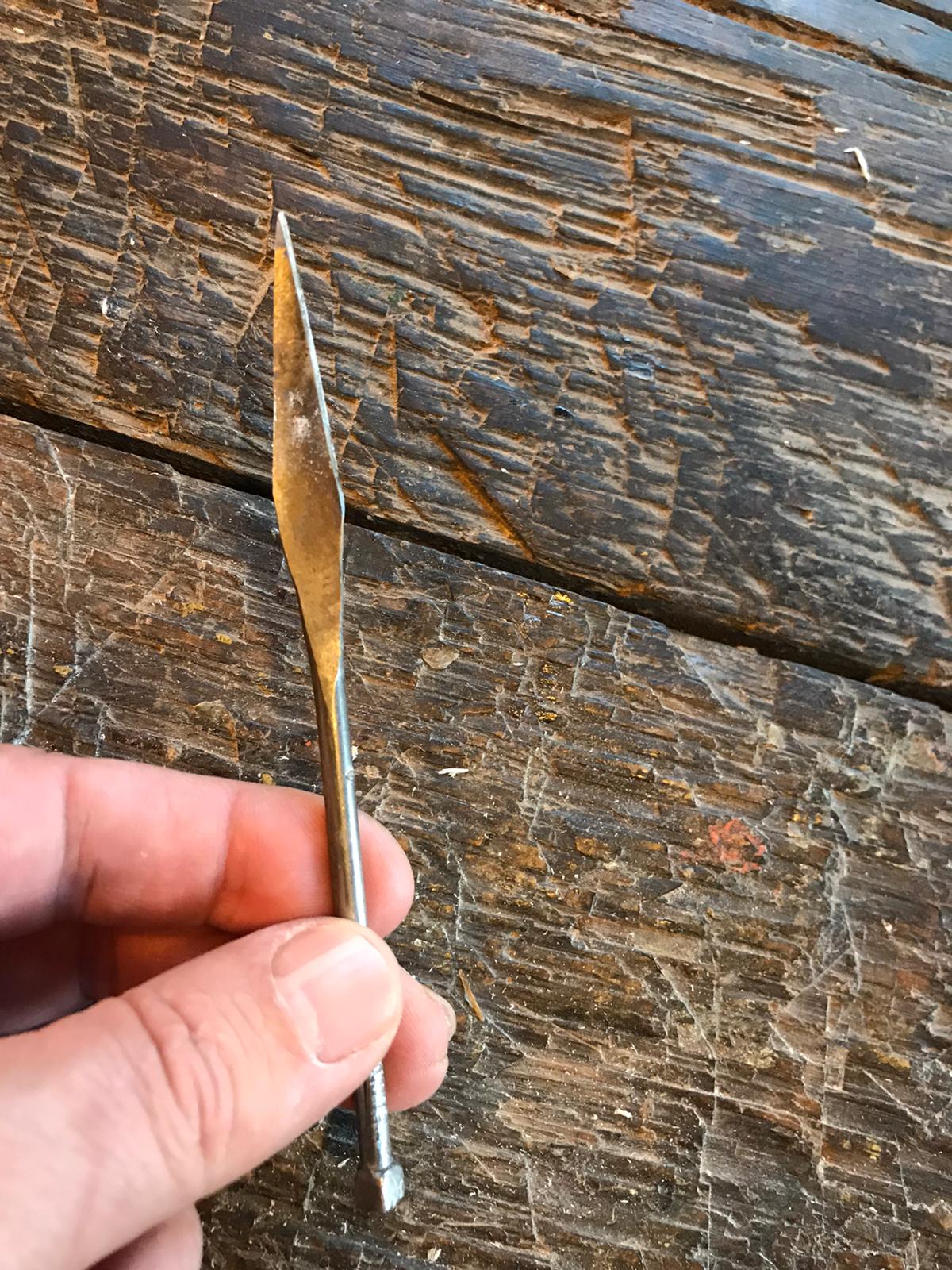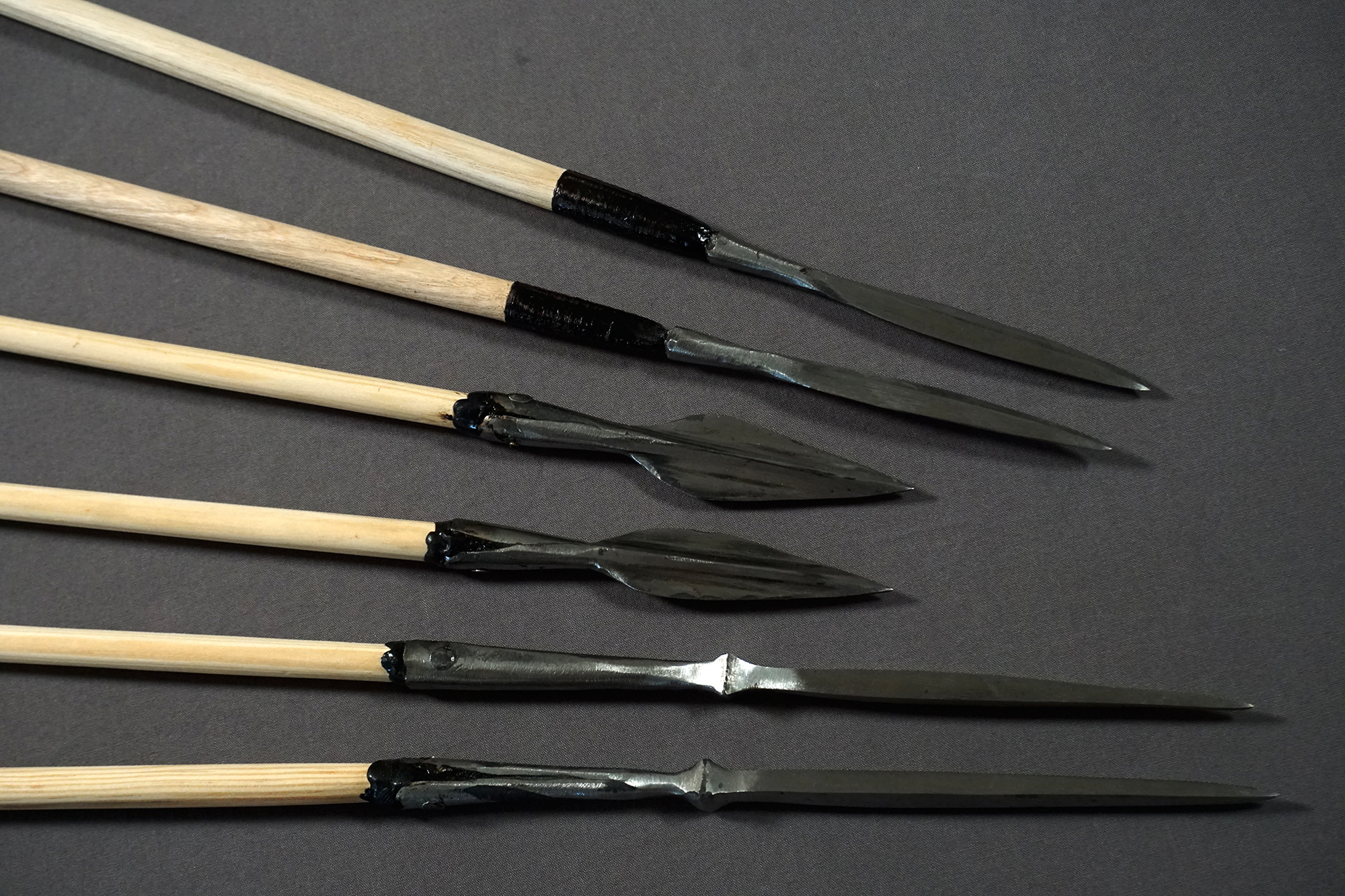 Zwar sind auch Spitzen aus Knochen gefunden worden, hauptsächlich wurden jedoch Spitzen aus Eisen angebracht. Dabei variierten die Ausführungen zwischen Dorngeschossspitzen (hier zwei) und Tüllengschossspitzen (hier vier). Spitzenrekonstruktion von Hector Cole.
