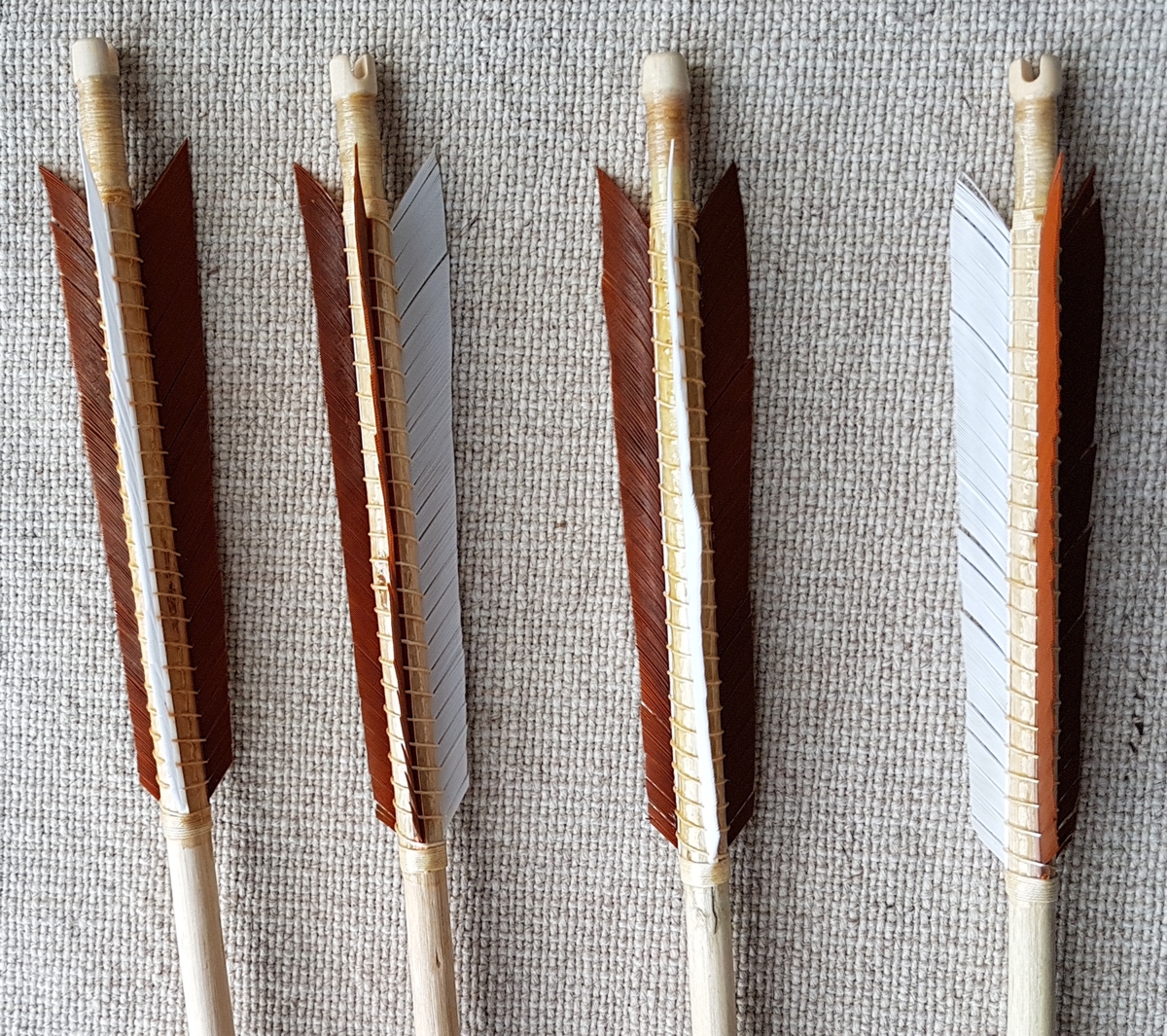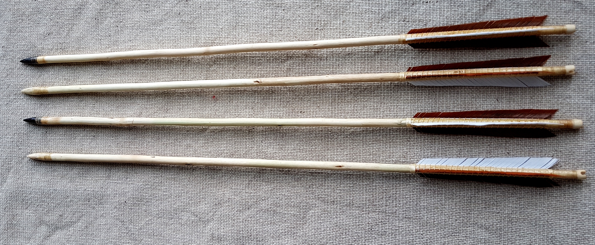 Die Federn sind Truthuhn, mit Hautleim geklebt und etwas dickerem Leinenzwirn (zu Testzwecken) als ich normalerweise nehmen würde gewickelt. Alle Klebestellen und die Wicklung sind mit einer Schellack-Benzoe-Mischung versiegelt. Außerdem sind die Pfeile noch 2x geölt und werden noch mit meiner Standard Wachs-Harz-Mischung versiegelt.