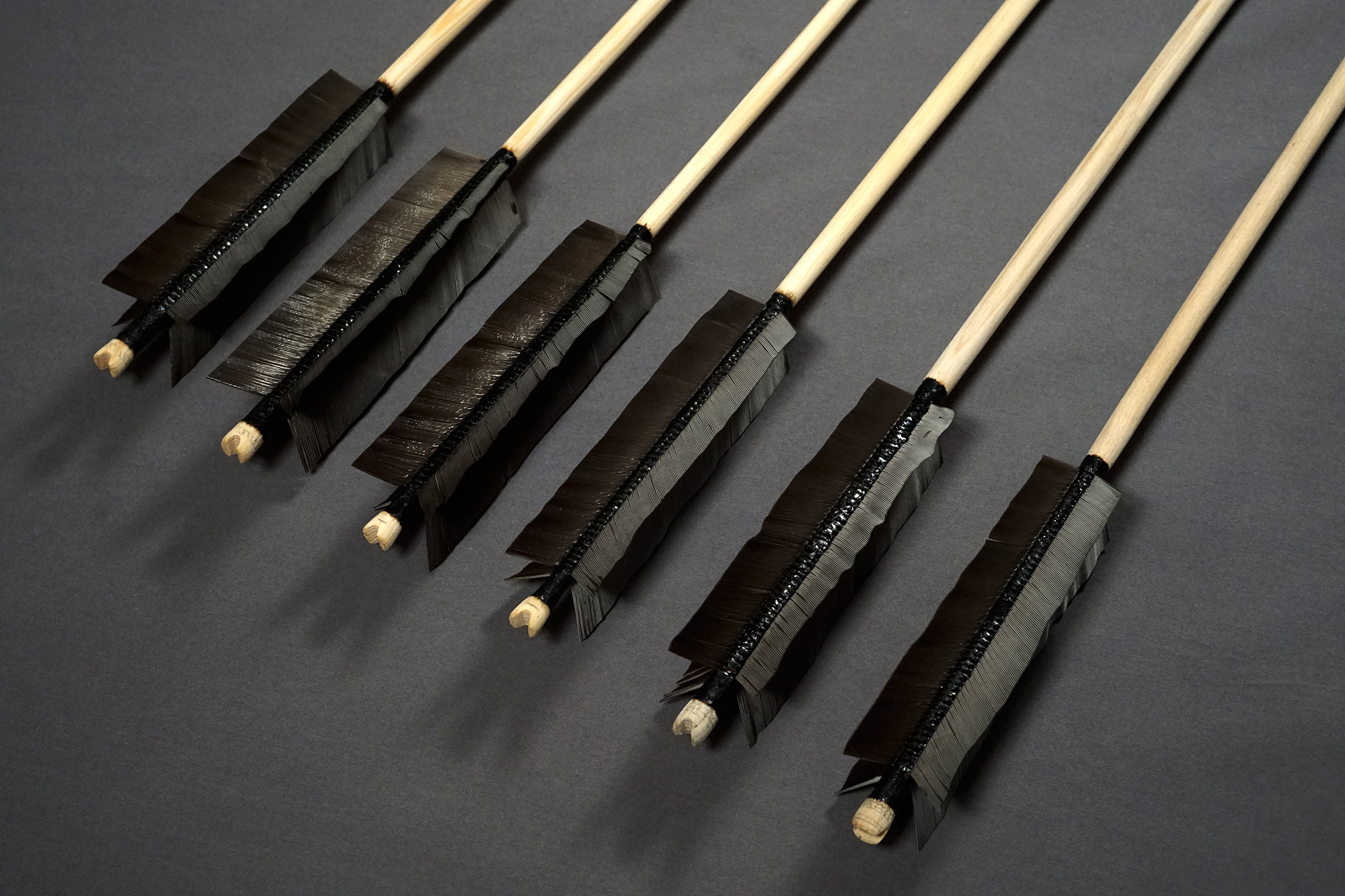 Die Schäfte bestehen aus Kiefer und Esche und besitzen eine tonnenförmige Gestaltung (barreled). Der Befiederungsbereich wurde abgesetzt, was einen ebenen Abschluss durch das Birkenpech und den Flachs für die enge Fadenwicklung gestattet.