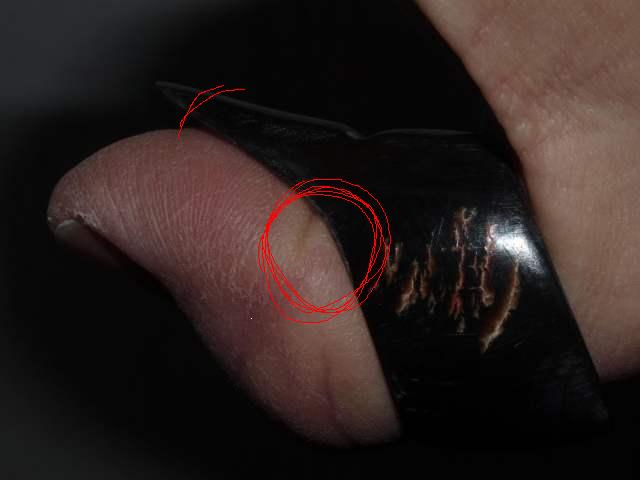 Wichtig war mir, dass ich die Form meines Daumens nachbaue, um ein möglichst weiches Lösen zu bekommen. Das war erfolgreich. Der Bereich im dem die Sehne anliegt ist bei verriegeltem Daumen genau rechtwinklig zur Pfeilachse. Die Lippe ist kürzer, als die von Janitschar errechnete Länge mit dem Goldenen Schnitt.
