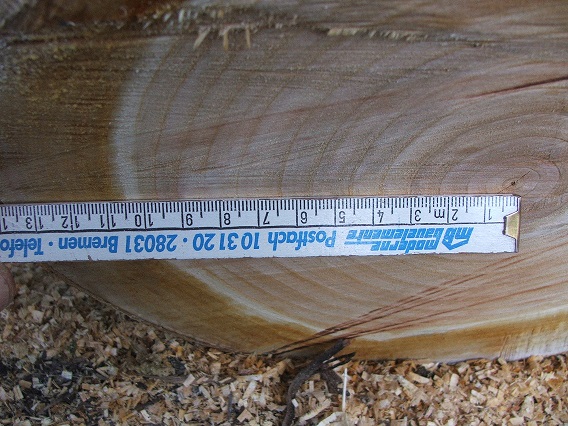 Habe in 6 Teile gespalten, entrindet und jetzt liegt sie mit weiß gestrichenem Rücken und Stirnseiten im Keller. Mal sehen ob da ein Bogen raus kommt, in der Not kann ich immer noch die geraden Stücken raus schneiden und spleißen.