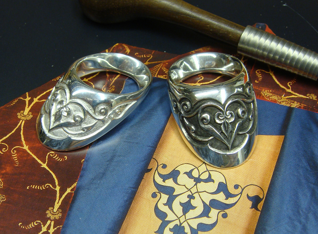 Jenes belegen auch die historischen Vorbilder - Prunk- und Statusringe aus Stein, Glas und Metall gab es; in Praxi wurden diese jedoch nicht eingesetzt. Sie sind eben eher Deko.... - wie z. B. auch Prunksäbel o. ä. .