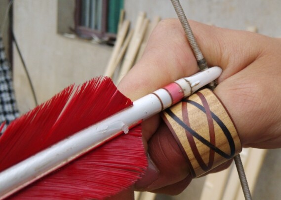 Man erkennt recht gut die Haltung der Bogen- und der Zughand, bezogen auf den mandschurischen Schiessstil (oh je, drei mal "s"....). Daumenringe sind leider nicht mit abgebildet.