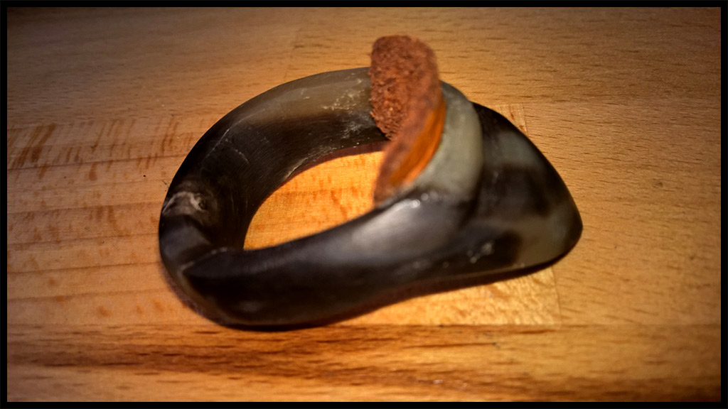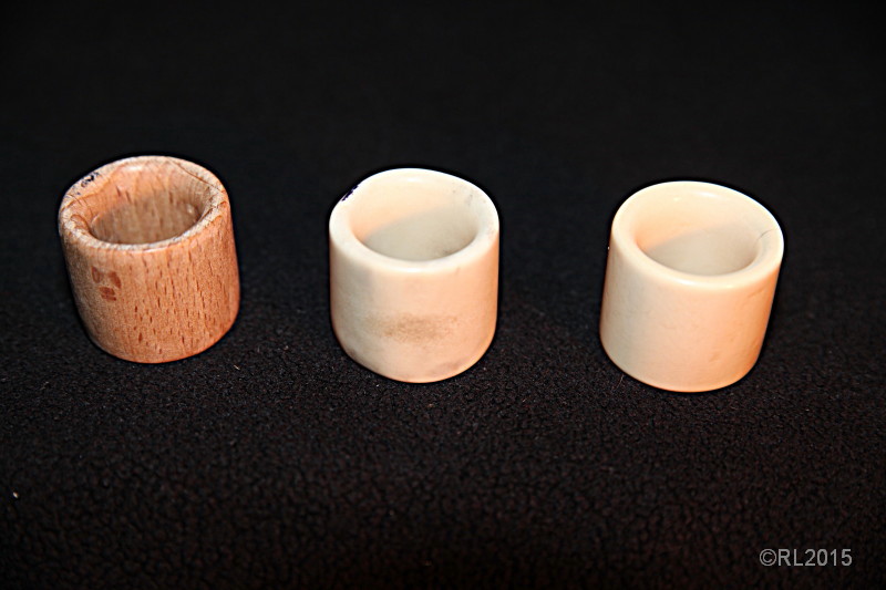 Dem Material geschuldet, erwies sich dabei der RIng aus Elfenbein in jeder Hinsicht als der schußkomfortabelste; auch im Vergleich zu (hier nicht abgebildeten) Ring aus Knochen.