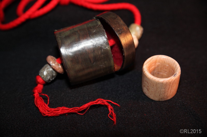 Drei chinesisch-mandschursiche Daumenringe sowie einfache Daumenringaufbewahrungsboxen in Anlehnung an historsiche Vorbilder.