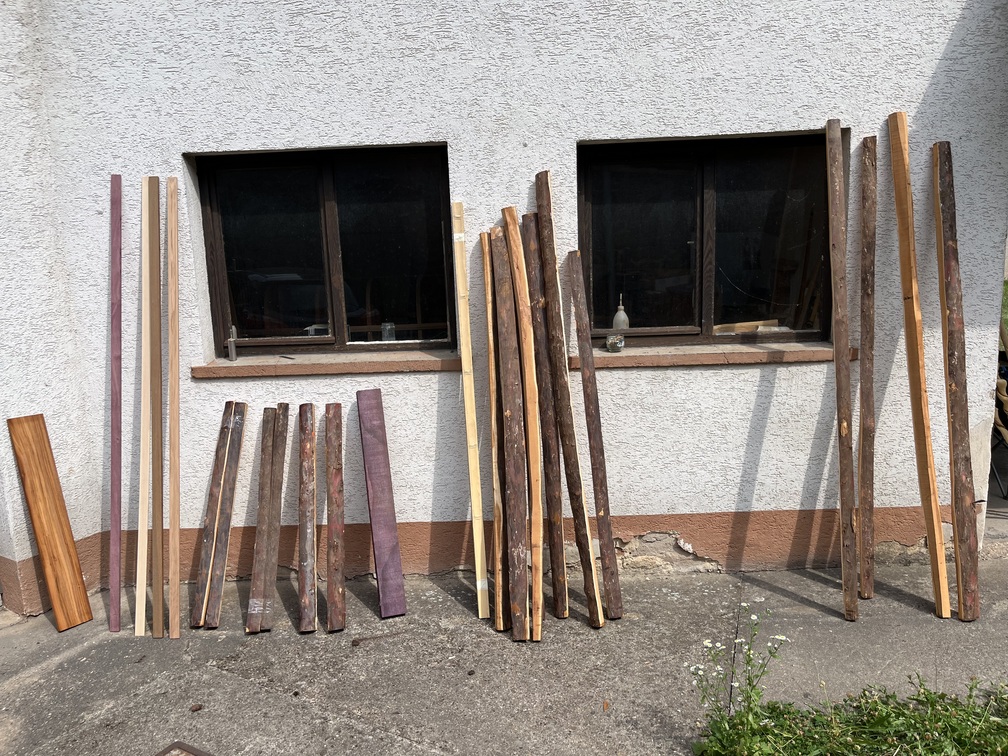 vlnr: Tigerwood, Purpleheart, Hickbacking, Ipe, Hickkernholzlaminat, Paz. Eibe Billets, Purpleheart in Kurz, Bambusbackings und a kleines bissl paz. Eibe Staves