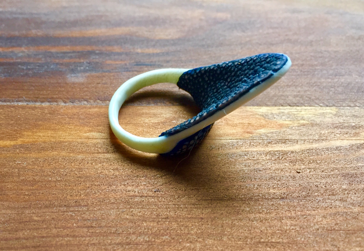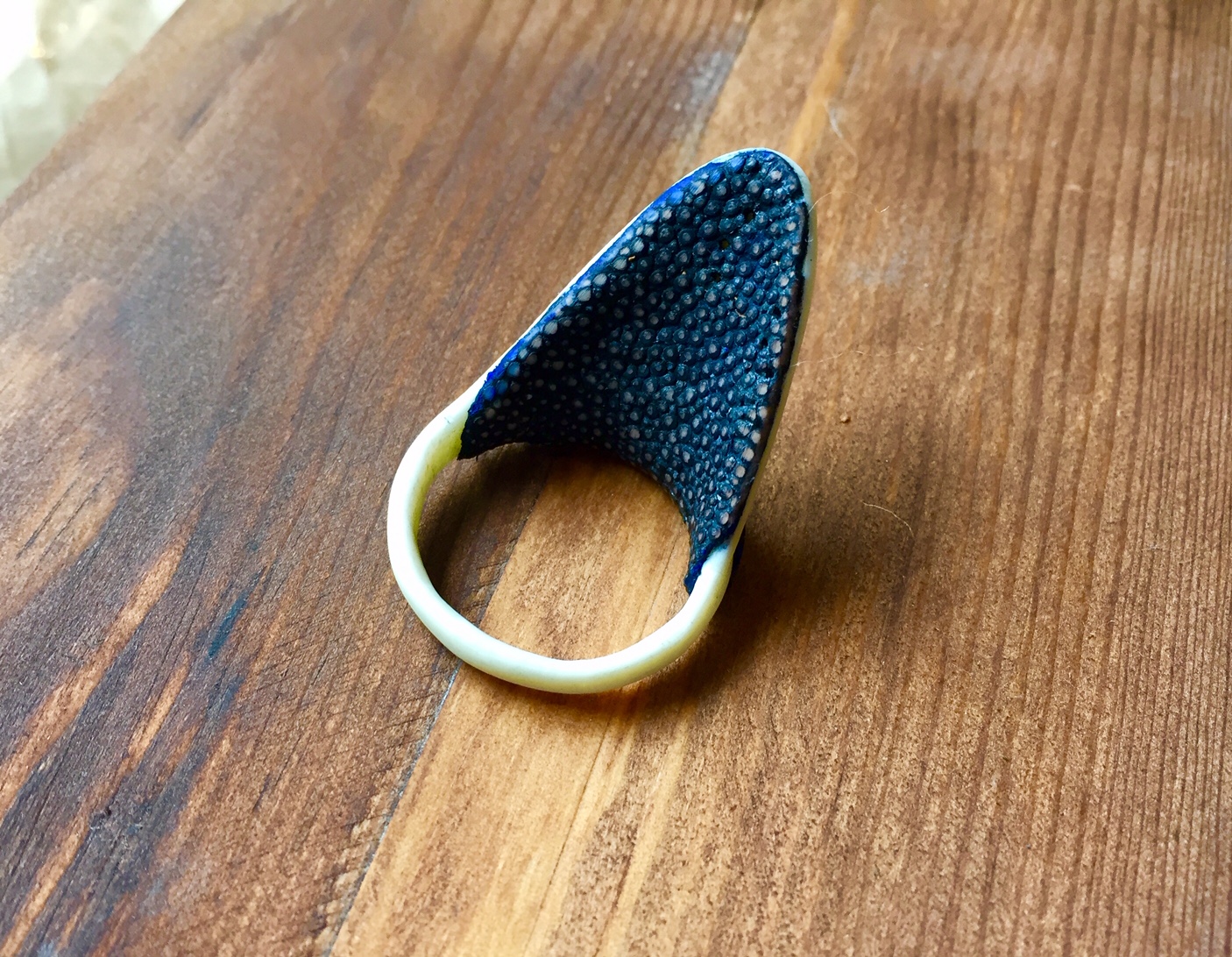 In der Hoffnung, dass mein nächster Komposit hält, habe ich mich auch mal an einem Daumenring versucht. Ich hatte noch Rinderknochen und blaues Rochenleder rumfliegen.