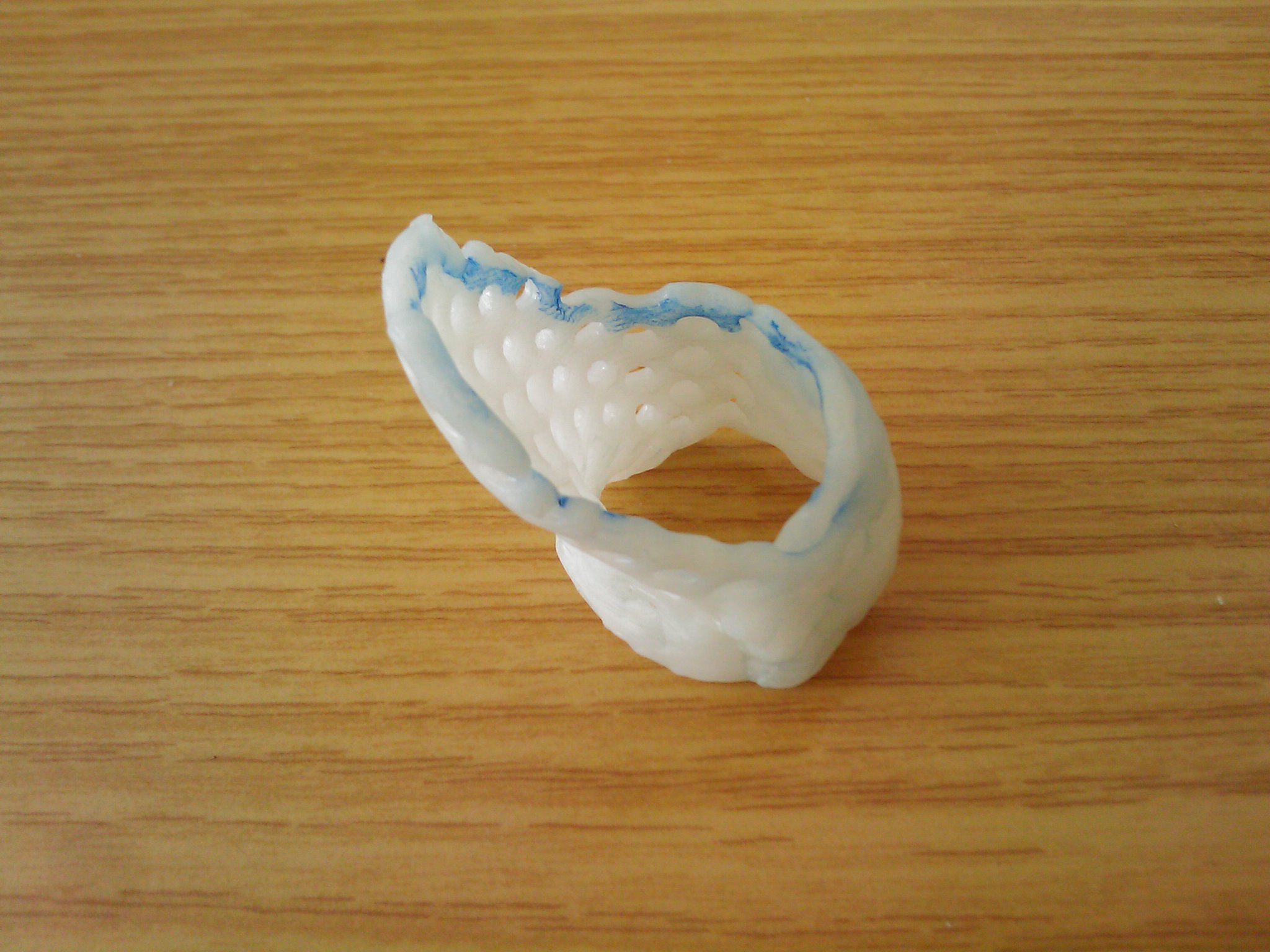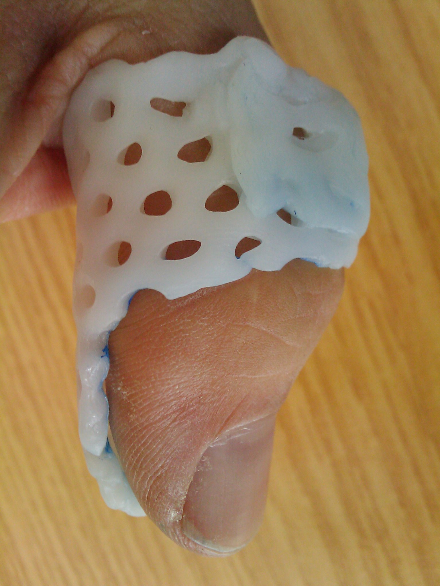 hier ist meinen 1. Versuch einen Daumenring aus thermoplatischen Material zu fertigen. Das ganze ist ein Kunststoff der bei ca. 60°C oder mehr durchsichtig und formbar wird. Bei noch höheren Temperaturen verklebt sich das Material auch noch. ;D