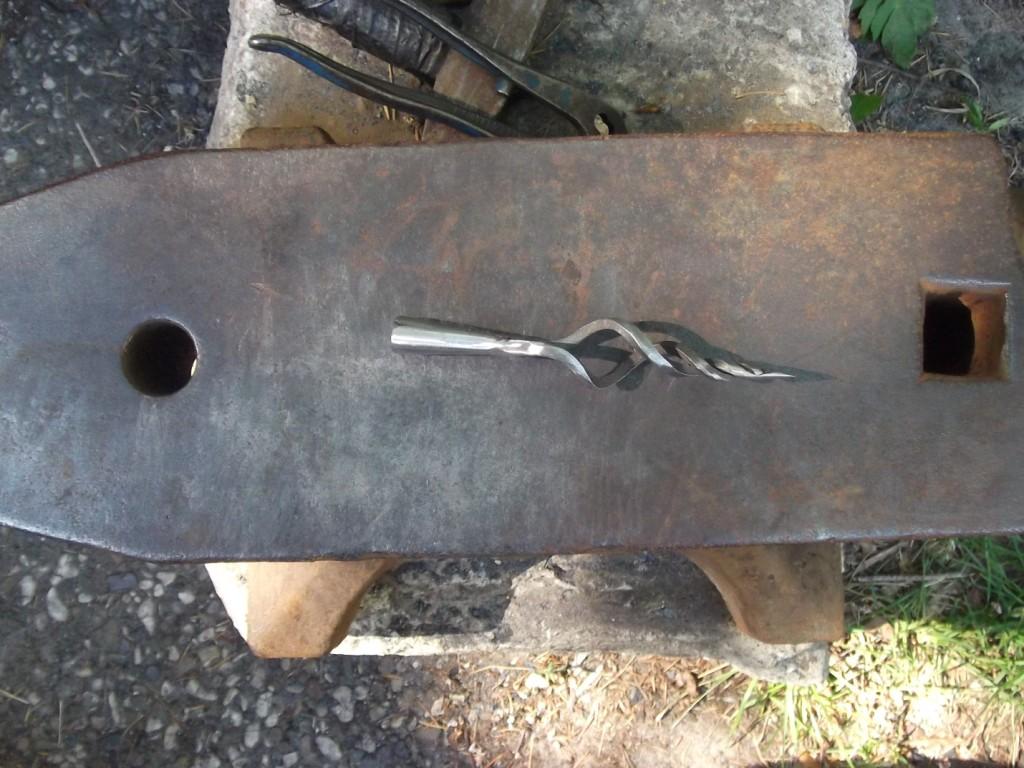 Eigentlich ist die Spitze auch mehr oder weniger ein geretteter Fehlversuch, ursprünglich sollte der Käfig aus drei Stangen bestehen, nur ist mir beim Spalten ein kleiner Fehler unterlaufen und die dritte Spitze ist mir (natürlich erst NACH dem Ausschmieden...Grrr..