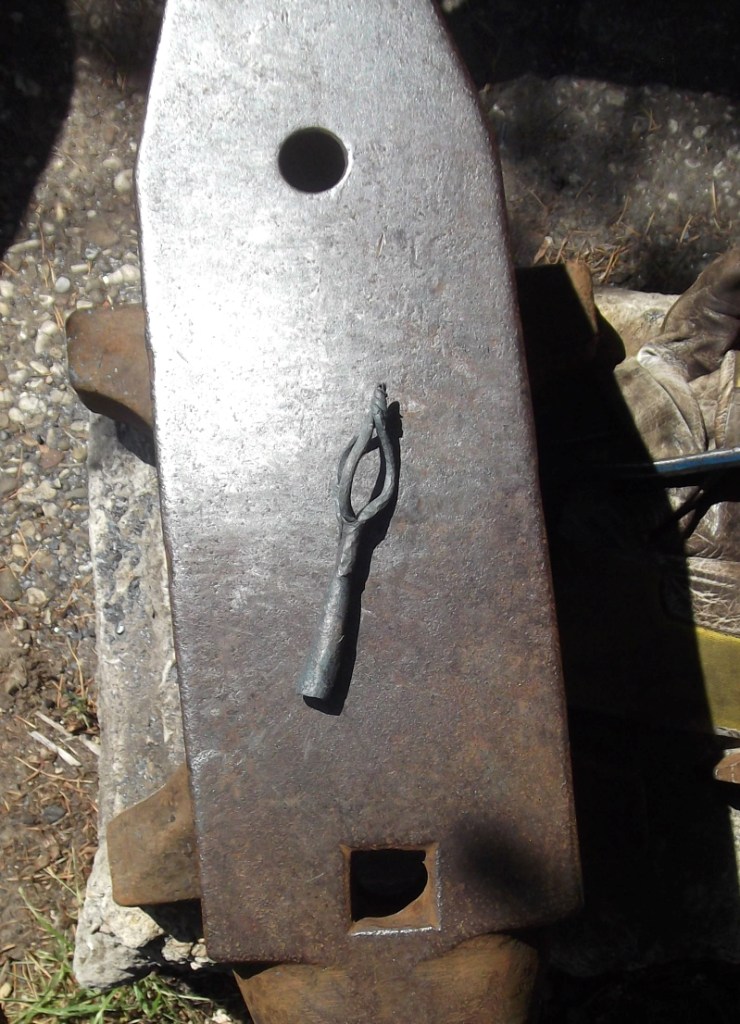 Wird doch wie bei den Zaun Verzierungen zwei schmale stäbe ausgeschmiedet nach vorne gebogen an der spitze zusammengeschmiedet Komplet erwärmt verdreht und beim zurückdrehen stellt es sich so birnenförmig auf
