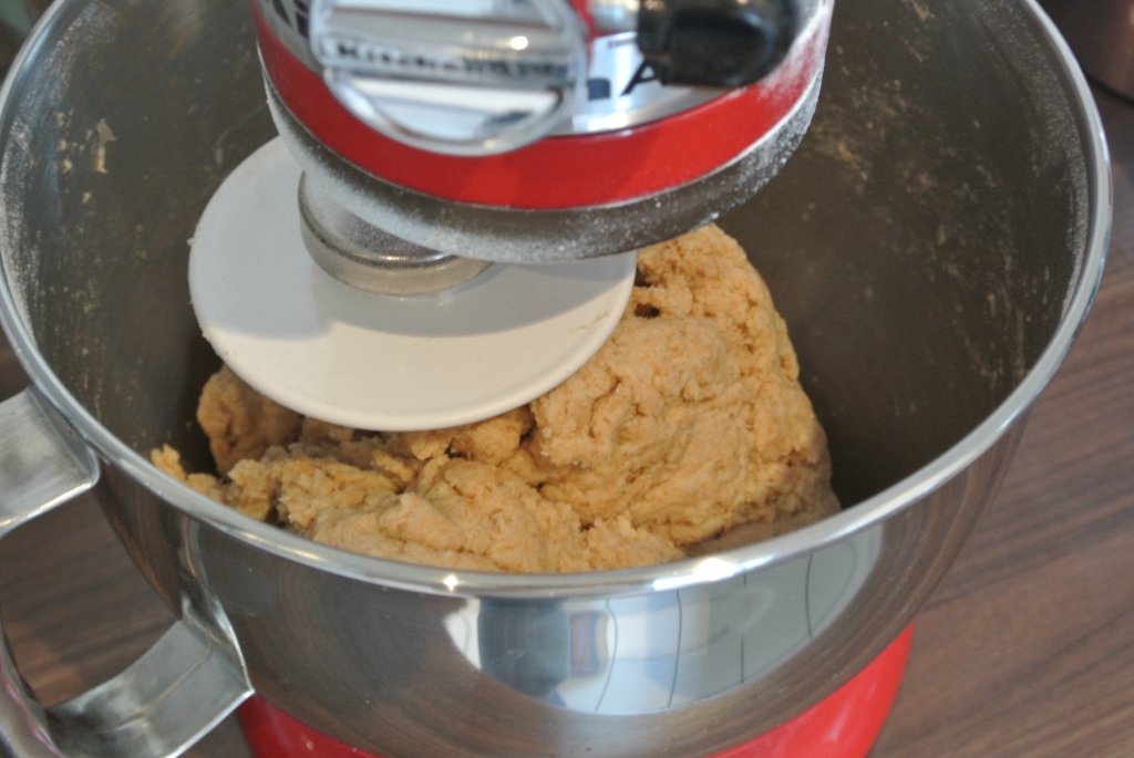 Zuerst hab ich Eier, Quark und Butter per Küchenmaschine verrührt. Da das später ein recht fester Teig wird, empfiehlt sich hier der gröbste Rührhaken, den man so auftreiben kann.