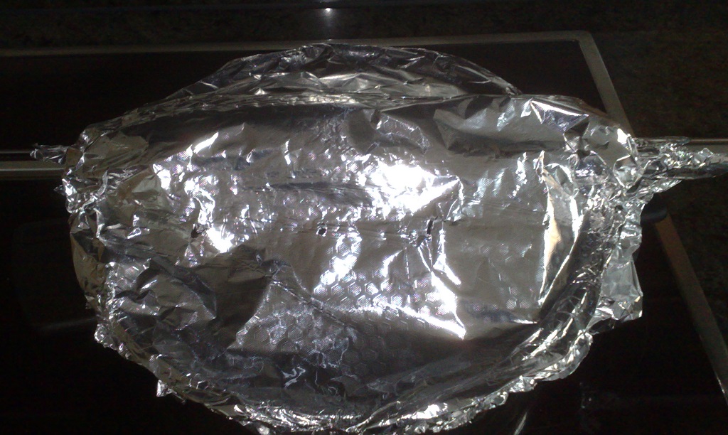 Ich nehm ein Stück Alufolie doppelt, irgendeinen runden Gegestand (iss halt ne Gurke, aber iss ja egal, was es iss) und dann seitlich davon die Löcher gestochen. Dann nen runden Folienrücken gemacht, das Holz (iss jetzt halt n Besenstiel) so hingelegt, dass es den Topfrand nicht berührt. Folie drüber und am Topf und Holz rangeformt und dann Hitze drauf. Ich denke, dass man aufpassen sollte, dass möglichst wenig Stellen (am besten keine) entstehen, an denen der Dampf kondensiert und aufs Holz tropft (also die Delle, die ich rechts oben gemacht hab, sollte nicht sein). Deswegen hab ich die Dampfablasslöcher auch seitlich angebracht, denn hier tropft sicher Wasser ab und das müsste eigentlich kälter sein, als der Dampf (ich bin kein Physikexperte, aber ich glaube, dass das stimmt). Jetzt wird das Holz praktisch nur von heissem Dampf umhüllt und kann sich gleichmässig erwärmen.