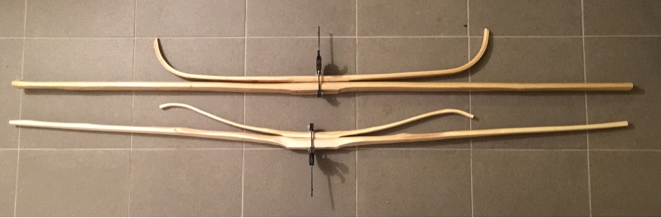 Hier mal beide mit ihren jeweiligen Vorbögen: Beide sind jetzt 170cm lang. Der stärkere sollte eigentlich länger werden, aber der dicke Ast kurz vor dem Ende hat mir Angst gemacht..