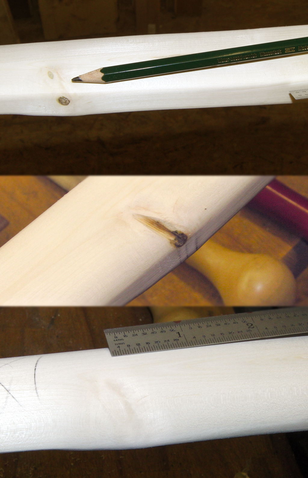 Zu Anfang musste ich die Knitterstelle genauer in Augenschein nehmen, dabei habe ich gesehen, dass ich übersehen hatte, nach dem Knubbel bei 10" des unteren Wurfarms, in dem der Totast versteckt war, etwas mehr Holz stehen zu lassen, weil rückenseitig danach plötzlich die Dicke abnimmt