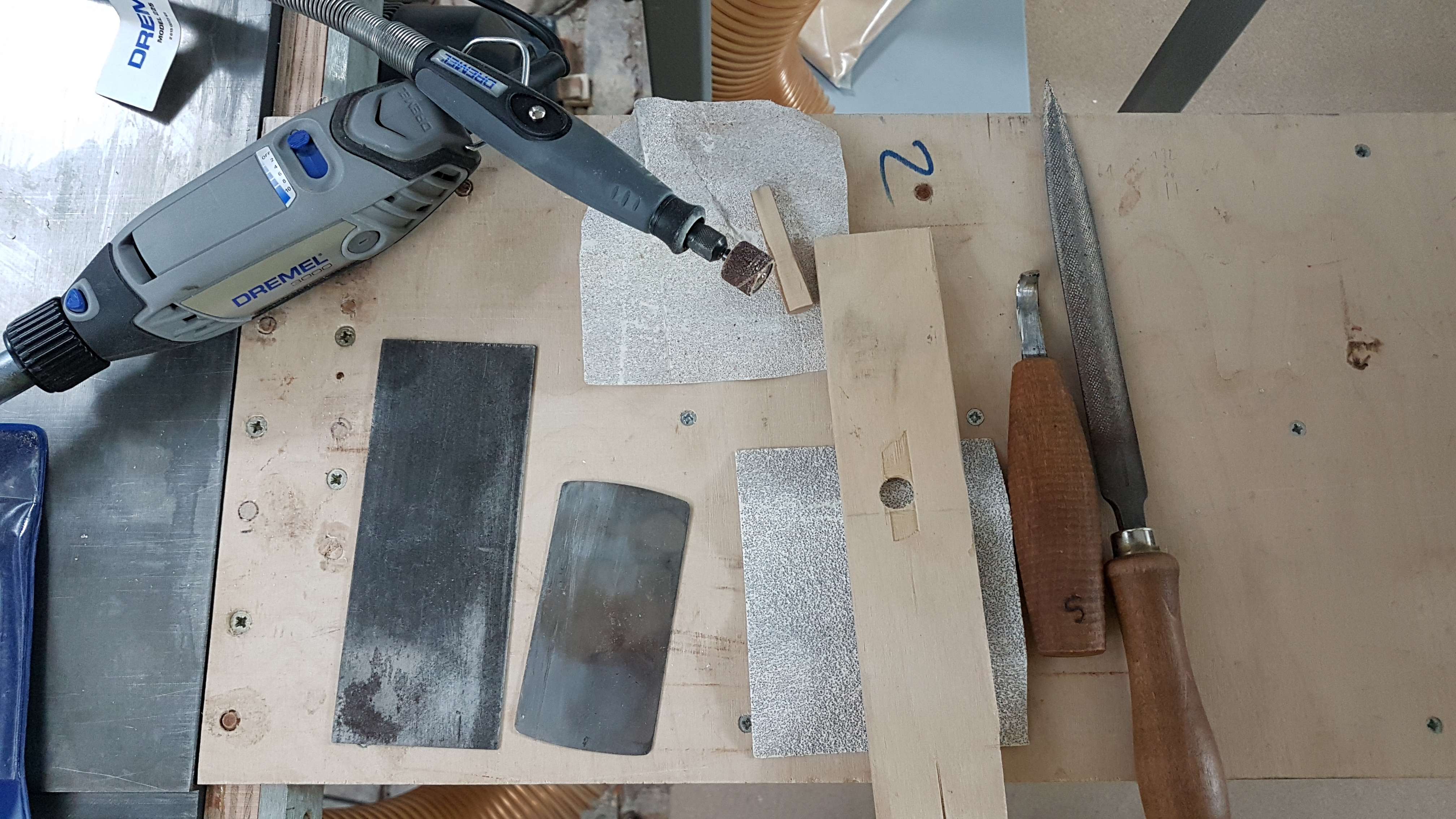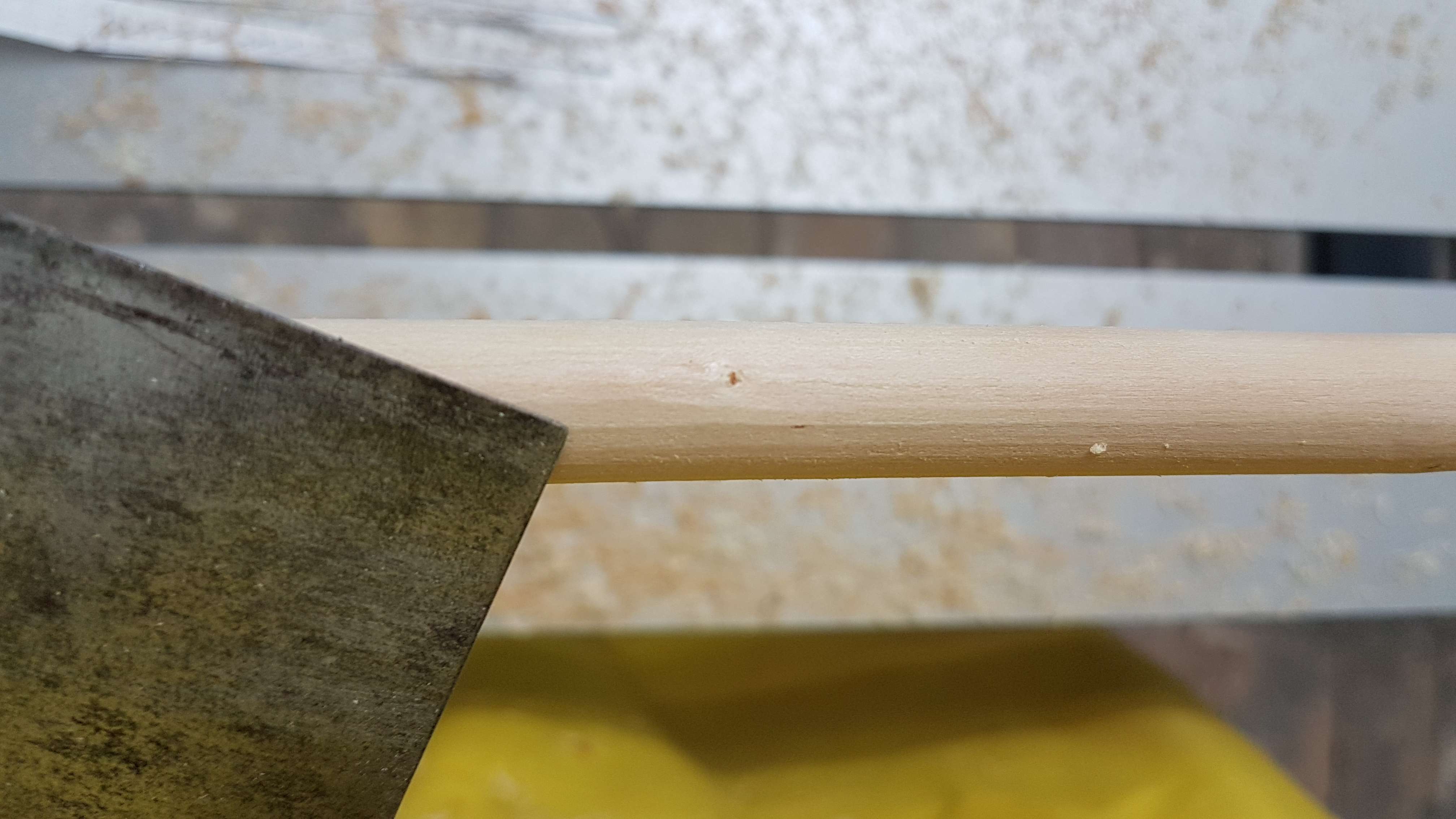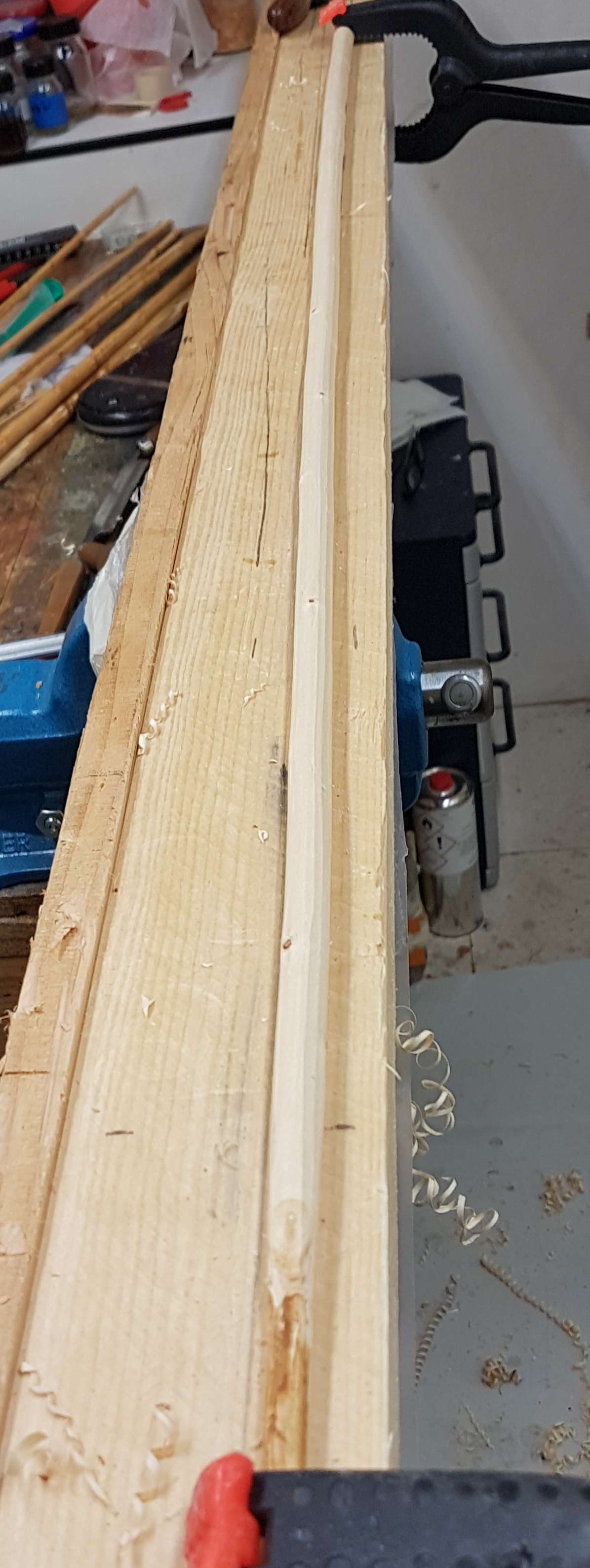 Vorgestern habe ich die Passung zwischen den Hasel und Kirschpflaumen Stangen verbessert. D.h. bei den verklebten Haseln die beiden Rinnen, in die die Kirschpflaumen eingeklebt werden, mit dem Dremel und Schleifpapier verbreitert und vertieft.