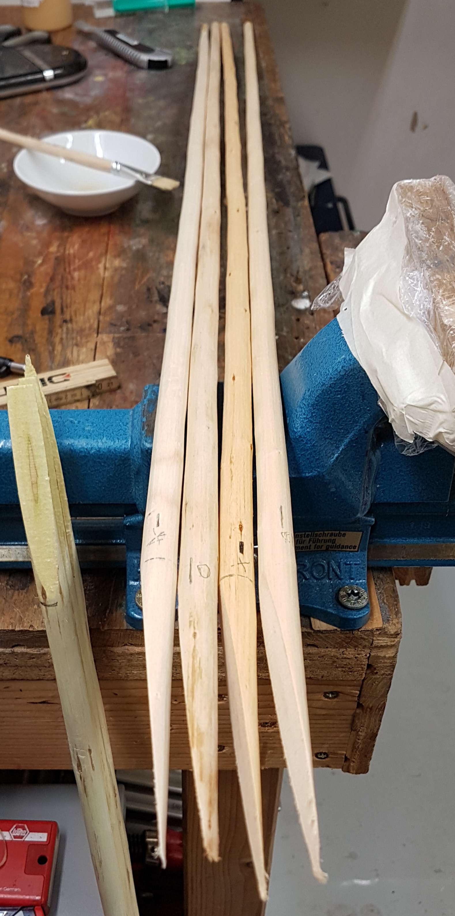 Dann habe ich 4 Kirschpflaumenstängel mit Hilfe des Schweifhobels auf etwa gleiches Gewicht gebracht - die Teile werden nochmal gerichtet, ich möchte möglichst wenig seitliche Spannung im fertigen Konstrukt haben.