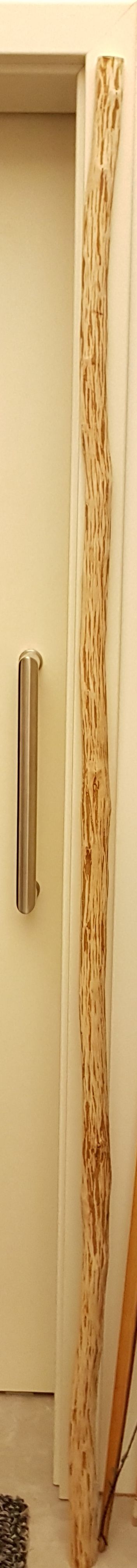 Heute habe ich noch eine zweite Hainbuche aus dem Keller geholt, die Mittellinie und einen möglichen Sehnenverlauf gepeilt, für gut befunden und in der Breite etwas reduziert. Das Stück hat sich zwar etwas gedreht, stört mich aber nicht, da es ein Stabbogen mit rel. rundem Querschnitt werden soll. Auf jeden Fall hat das Stück nette Kurven.