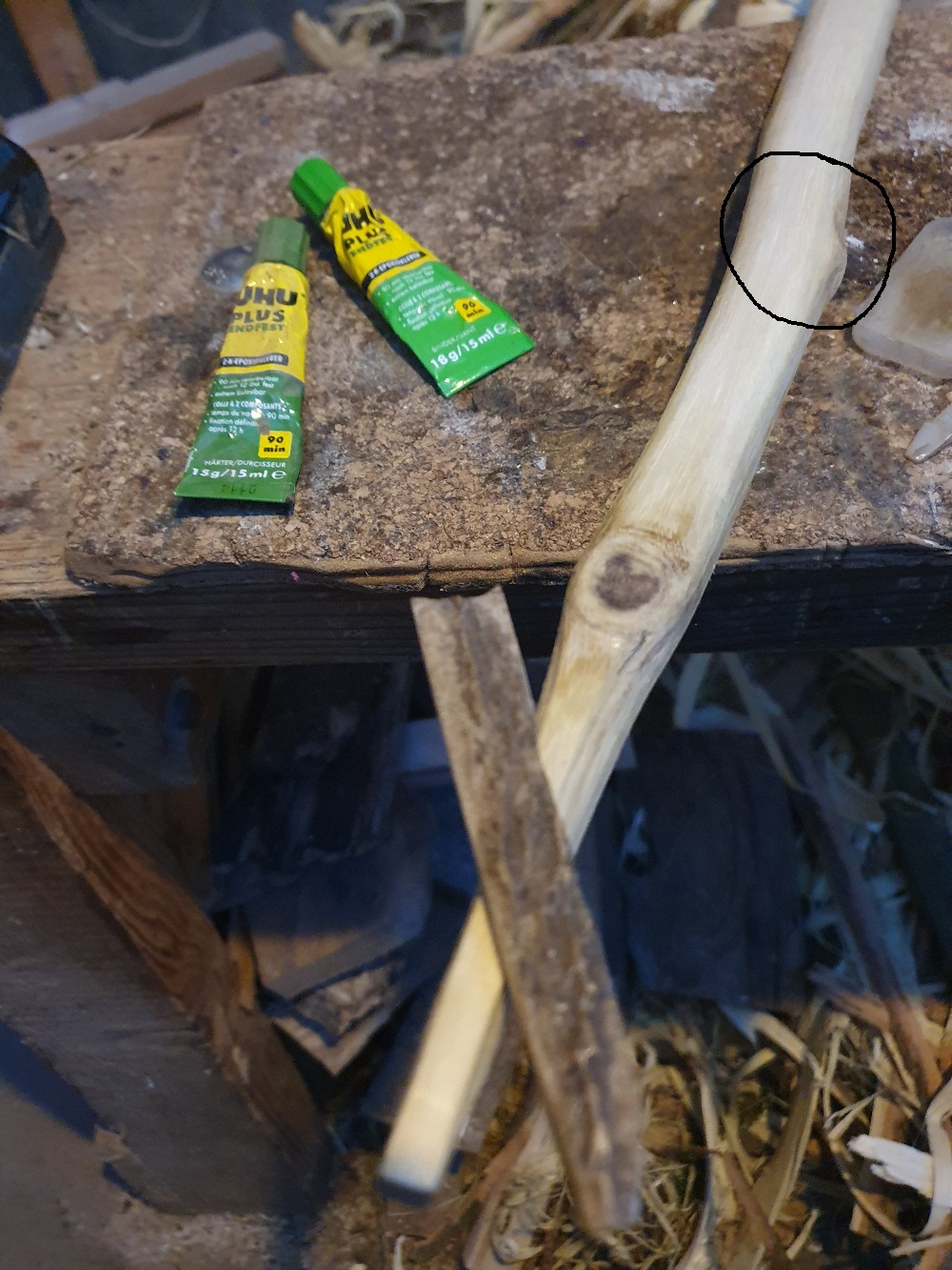 sehe ich auch so wie mein Kollege, besorg dir einen schönen geraden Haselnuss Sapling, du hast ja einen kleinen Holzofen, da ist der in ein paar Tagen fertig.