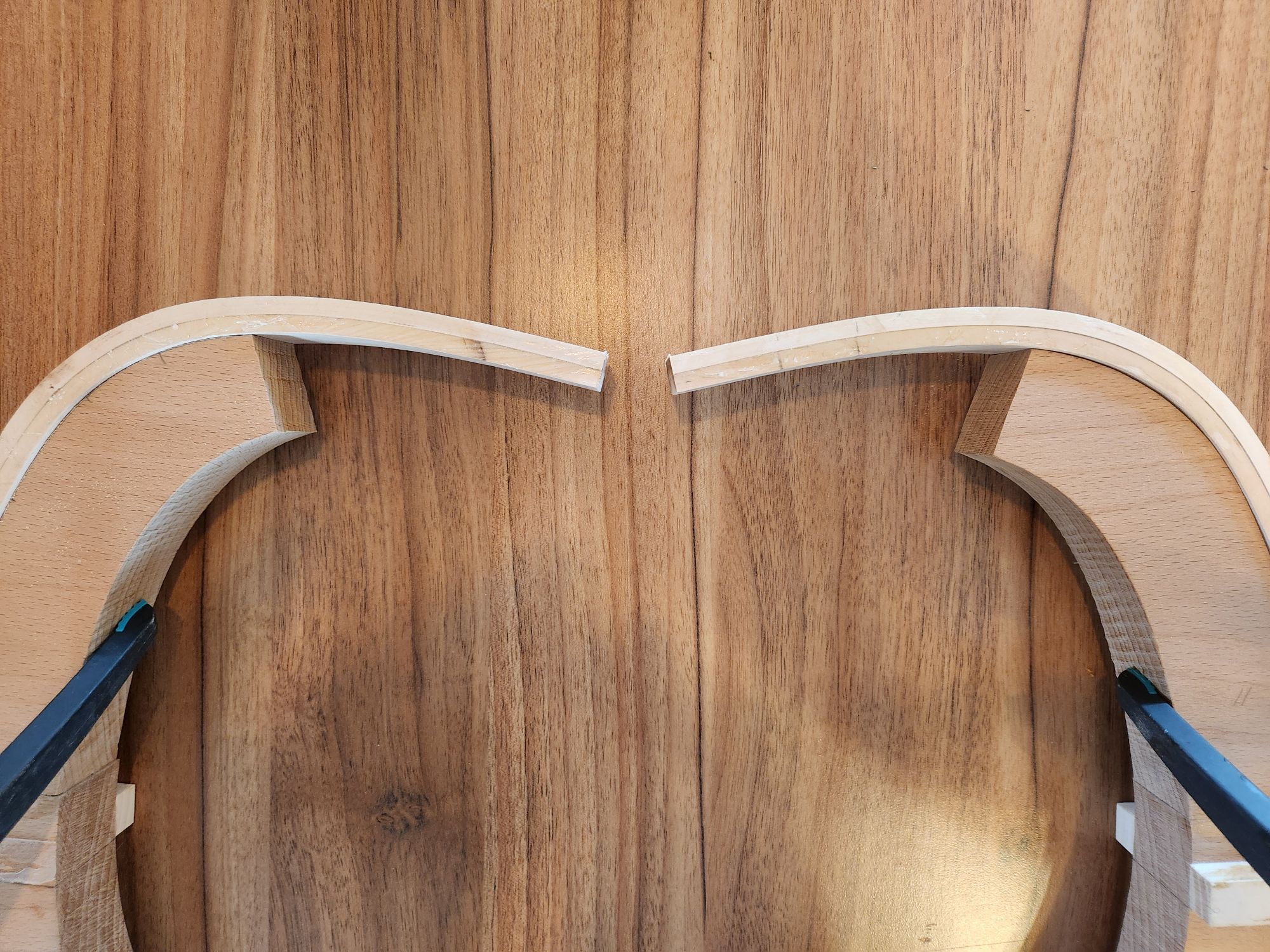 Die Hornstreifen hab ich auch in der Breite reduziert. Meine Laminierform ist nur 34mm breit und hat ja beidseitig Führungsklötze mit ebenfalls diesem Maß. Wenn man diesen Bogen dann nach den ganzen Klebearbeiten seitlich nacharbeitet bis alles gut aussieht kann man schnell mal bei einer breite von nurmehr 30-32mm landen. Diese Bögen wurden auch mit einer Breite von nur 25-30mm gebaut, weshalb mir das damals passend schien. Jetzt hätte ich aber doch gern die Option ihn breiter zu bauen und mehr reserven für Korrekturen zu haben. Deshalb werde ich das Maß zwischen den Führungsklötzen auf 36mm erhöhen. Die Hornstreifen sind jetzt auch 36mm breit und um noch mehr Raum für korrekturen zu lassen, werde ich die Siyahs diesmal noch nicht in Form bringen (wurde beim Original aber schon vorm Spleißen gemacht).