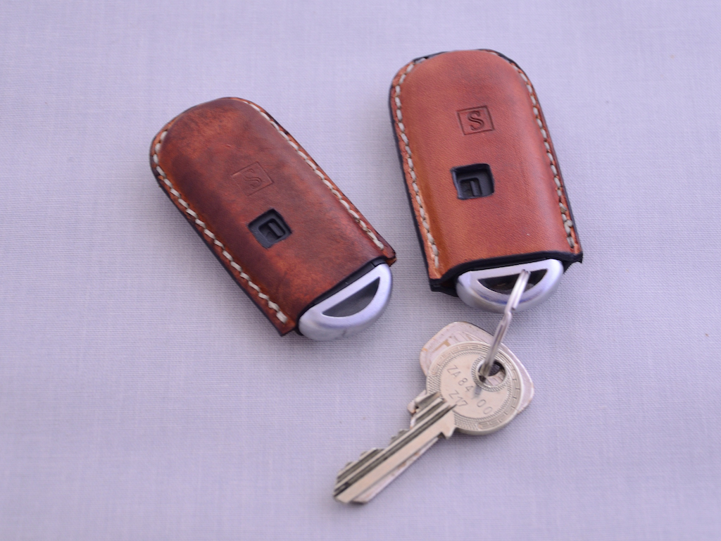 Die beiden Hüllen unterscheiden sich eigentlich nur durch das verwendete Leder. Das Leder für den Zweitschlüssel ist nur 1 mm dick, die andere 2,2 mm. Natürlich lässt sich das leichter nassformen ist beim nähen aber deutlich empfindlicher. Ich vermute auch diese Hülle wird nicht lange “leben“ ich habe beim quasi letzten Stich zu fest gezogen und das Leder durchtrennt.