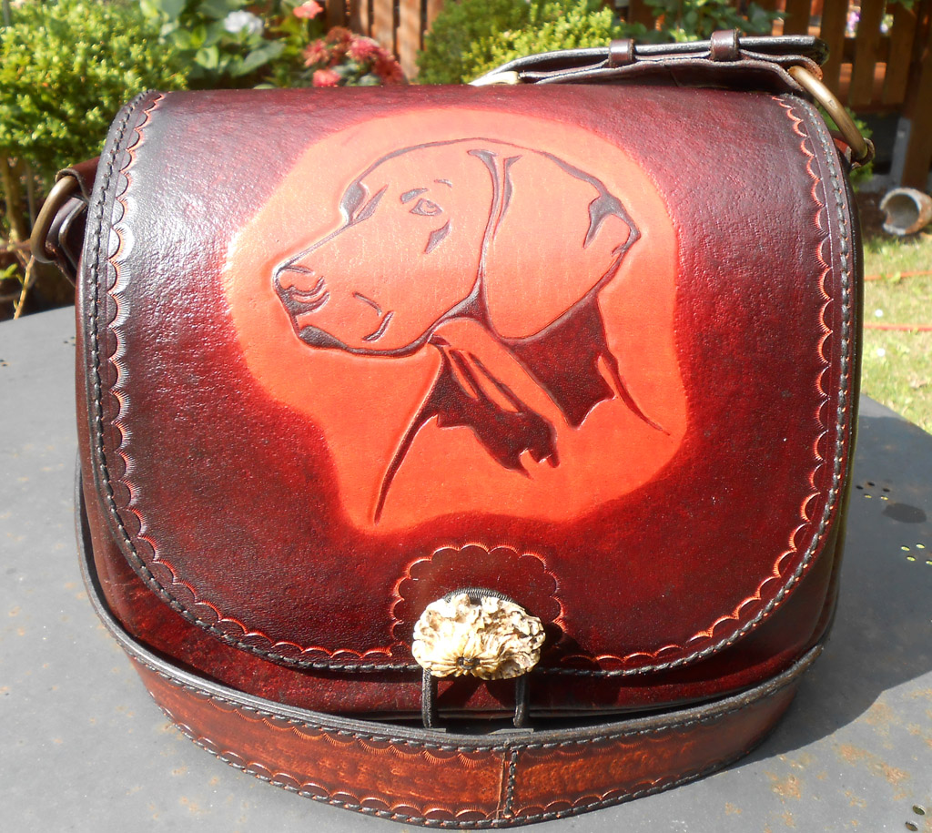 Eine Umhängetasche für einen Jäger. Gearbeitet aus 2 mm Büffelleder mit einigen Punzierungen. Das Motiv wurde vorgegeben. Vom Auftraggeber gab´s heute morgen die Rückmeldung: alle Daumen hoch.