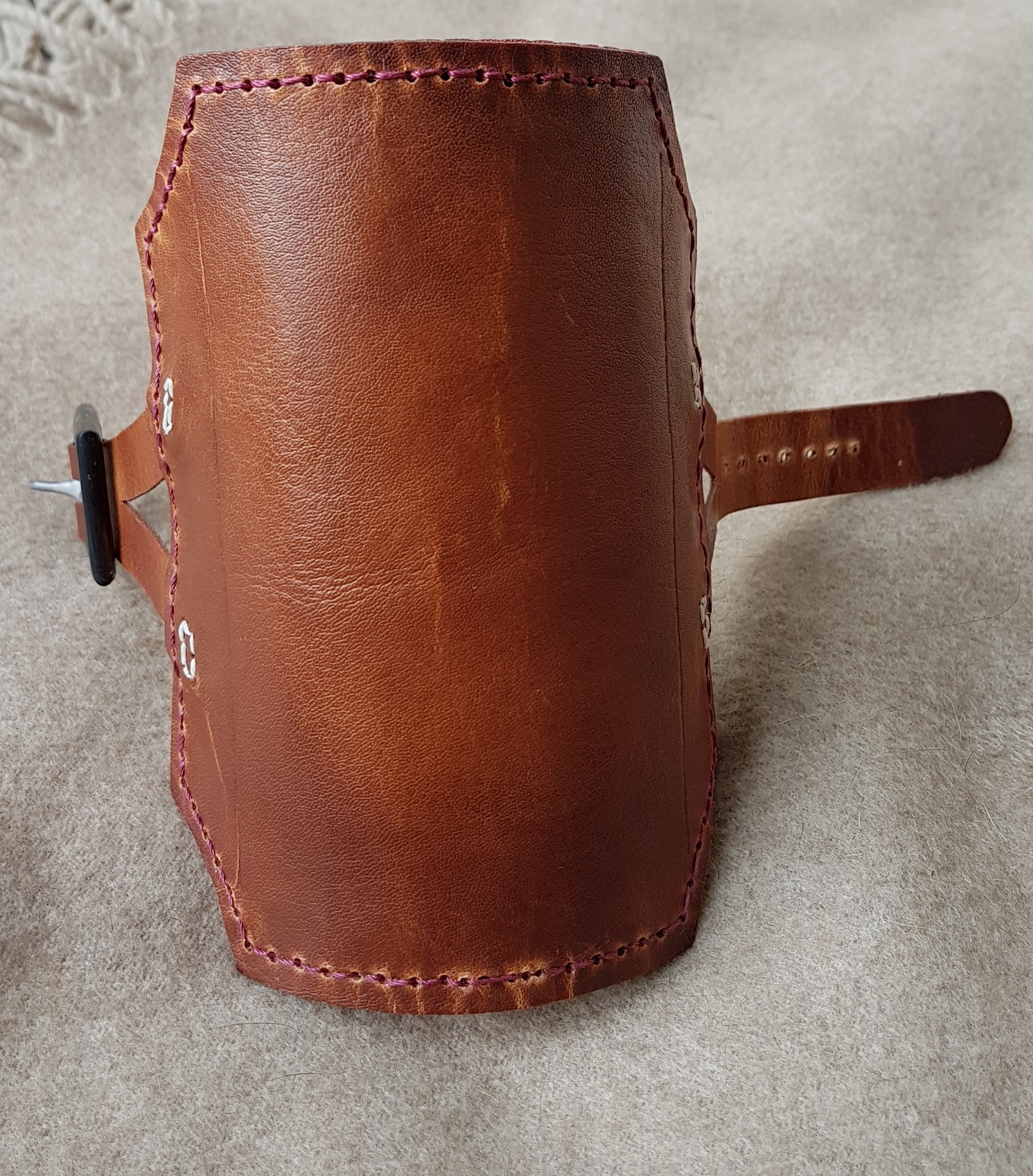 Tach, ich habe mir mal einen neuen Armschützer gemacht, im mittelalterliche Stil gehalten. Auf Verzierungen habe ich aber zunächst, bis auf 2 Linien, verzichtet. Die Nähte habe ich nicht versenkt, die Kanten sind nicht geglättet.