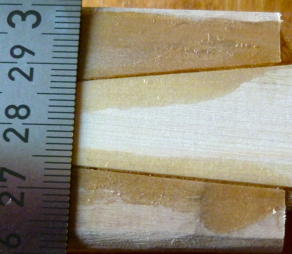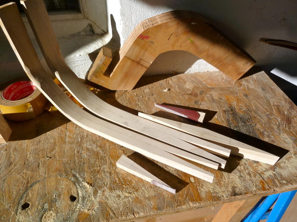Auch der zweite Kern macht Fortschritte, heute habe ich die Spleisse gesägt. Wieder eine dreiteilige Konstruktion. Dieser wird allerdings 6cm kürzer sein, also 121cm ntn. Gesägt habe ich diesmal mit der Bandsäge. Erfordert etwas mehr Nacharbeit als die Sägelade, geht aber ratz-fatz. Zum Glätten der Sägeflächen habe ich die Keile genommen, die beim Aussägen des Spleisses angefallen sind, und sie mit Schleifpapier beklebt. Grüße