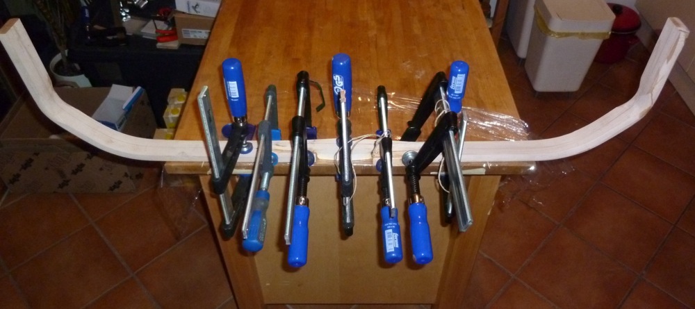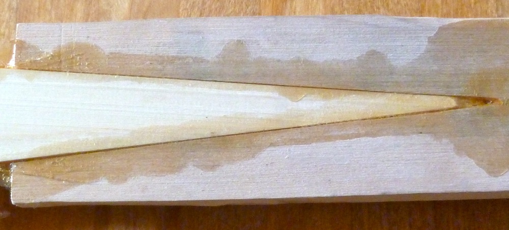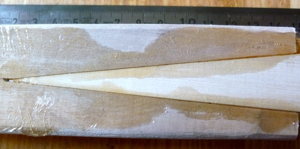 Ein paar Tage zuvor hatte ich die V-Spleisse 10 Minuten in kochendes Wasser gehalten, um sie dann an das Griffstück zu zwingen. Absicht war es, die Passform perfekt zu machen. Das brachte leider Komplikationen mit sich. Die V-Spleisse haben sich durch das heiße Wasser weiter geöffnet - zwischen männlichem (Griffstück) und weiblichem (Wurfarm) Teil klaffte am Auslauf nun eine ca. 3-4mm breite Lücke. Nach dem Zwingen und Trocknen war es immer noch ca 1-2mm. Ich habe beschlossen, die Teile trotzdem miteinander zu verleimen, weil die Passform im zusammengedrückten Zustand gut war. Das Endergebnis ist aber nicht so gut wie die Spleisse des ersten Holzkerns: