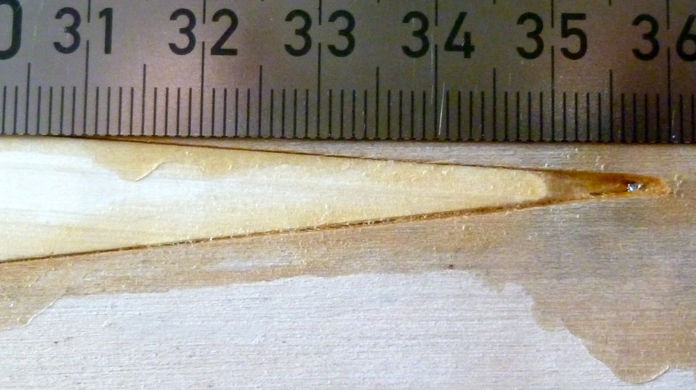 Wie man sieht, ist die Leimfuge links im Auslauf und rechts in der Spitze recht breit. Ich glaube, dort im Leim winzige Luftbläschen zu sehen, bin mir aber nicht sicher. Wie schätzt Ihr das ein?