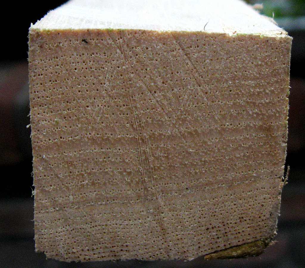 Im Querschnitt des WA liegen die Jahresringe fast. Sie sind nur um etwa 10° geneigt. Siehe Foto vom Stirnholz, weiter vorne.