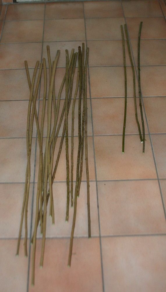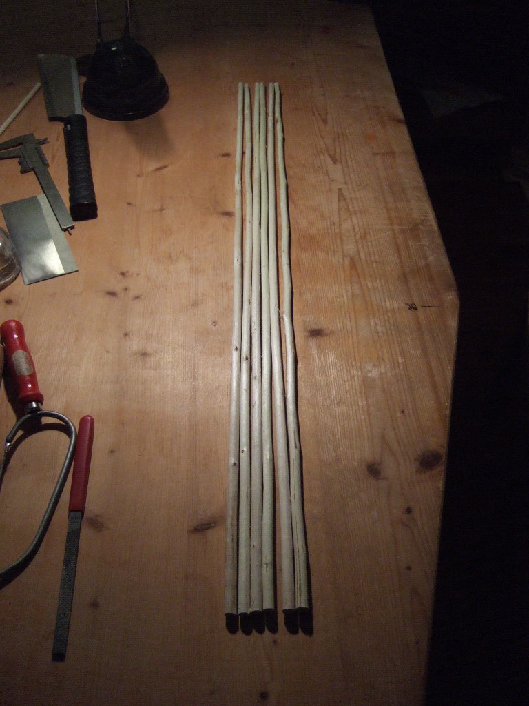 Das Bündel lag bis gestern in der kühlen Garage und durfte heute morgen in den etwas wärmeren Hausflur. Die nächsten Tage werde ich mal anfangen, die Schösslinge etwas zu richten und mal schauen, was ich an Federn und Material für die Spitzen finde. Geklebt wird alles mit Knochenleim und gewickelt mit Hirsch- oder Straußensehne.