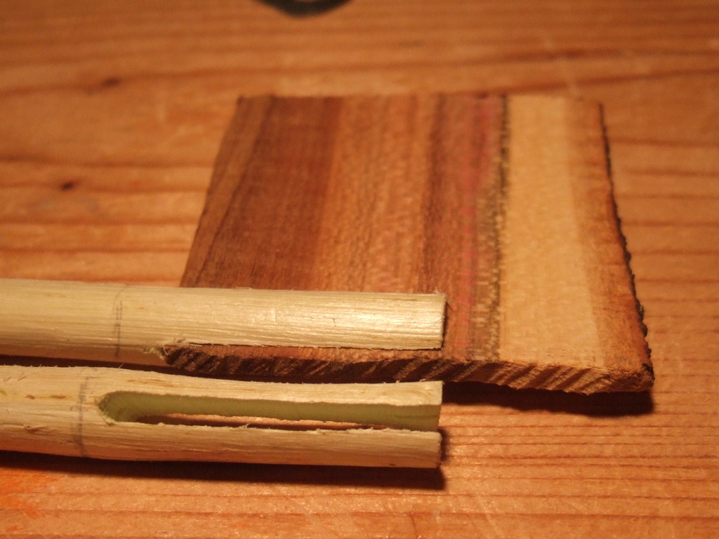 Bevor ich schlitze prüfe ich nochmal, wie die Sehne zum Pfeil verlaufen soll. Z.B. ist ein Schaft auf einer Ebene ziemlich snaky. 90° dazu ist er eben. Die Seite soll natürlich später "am Bogen anliegen".
