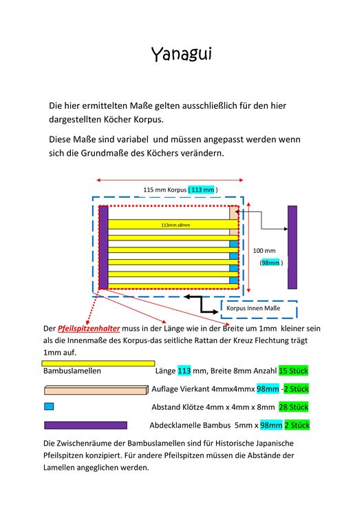 Das an einem Tragegestell befestigte kleine Körbchen besitzt für die Pfeilaufnahme ein Gitter mit dünnen Bambuslamellen (Yanagui- Pfeilbiss ). Die Pfeilspitzen wurden zwischen diesen Lamellen gesteckt. Das Yanagui gab den Pfeilen besseren Halt und verhinderte ein gegenseitiges Verhaken der Pfeilspitzen.