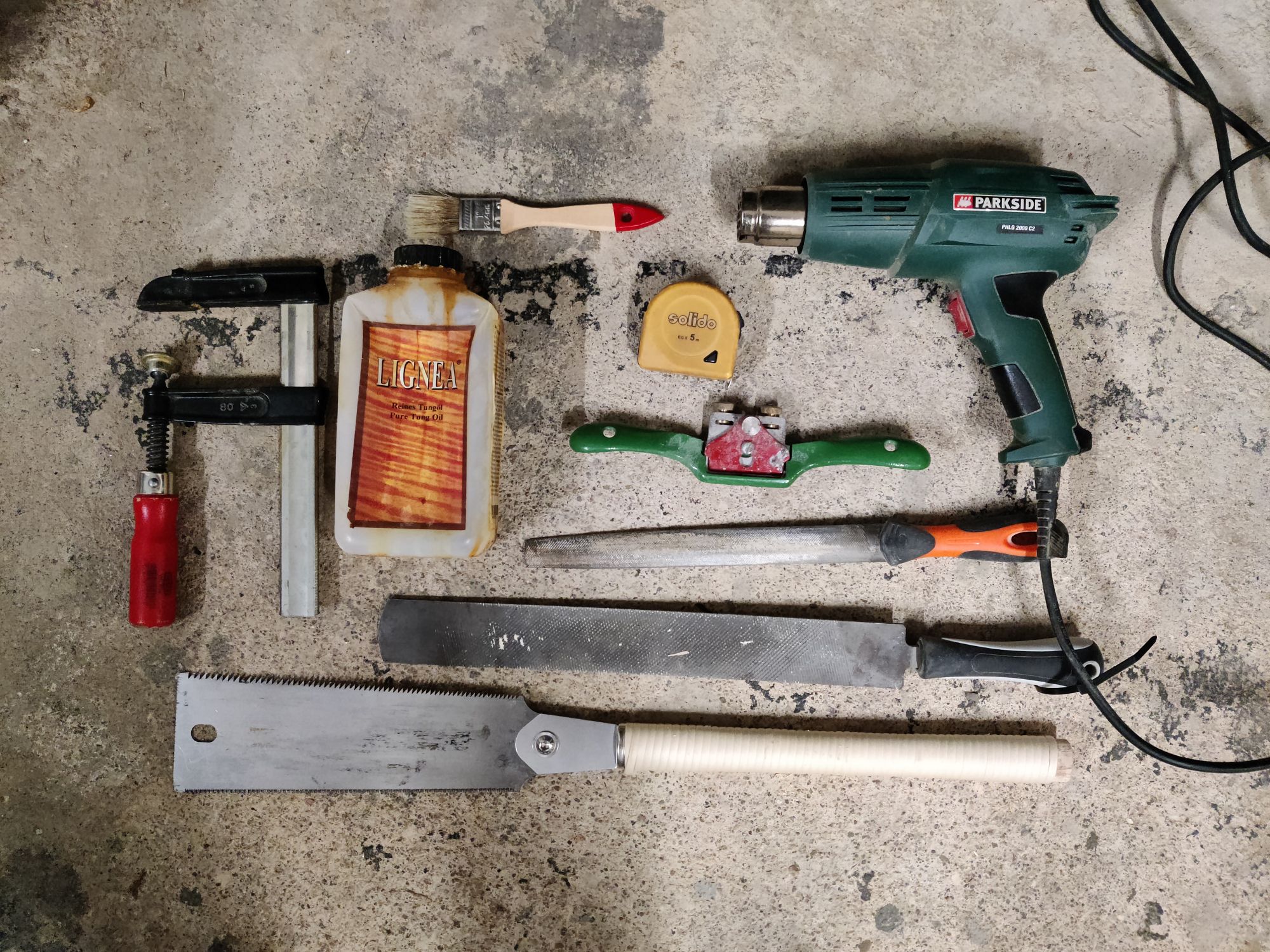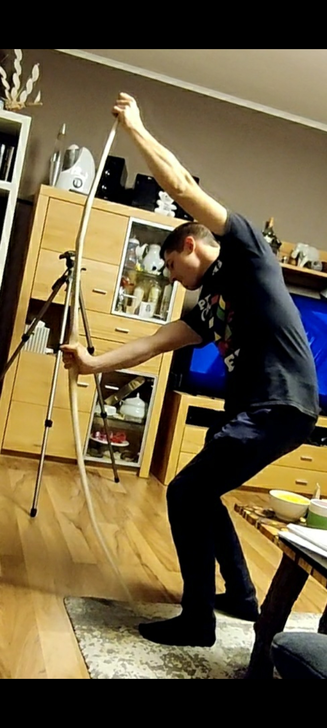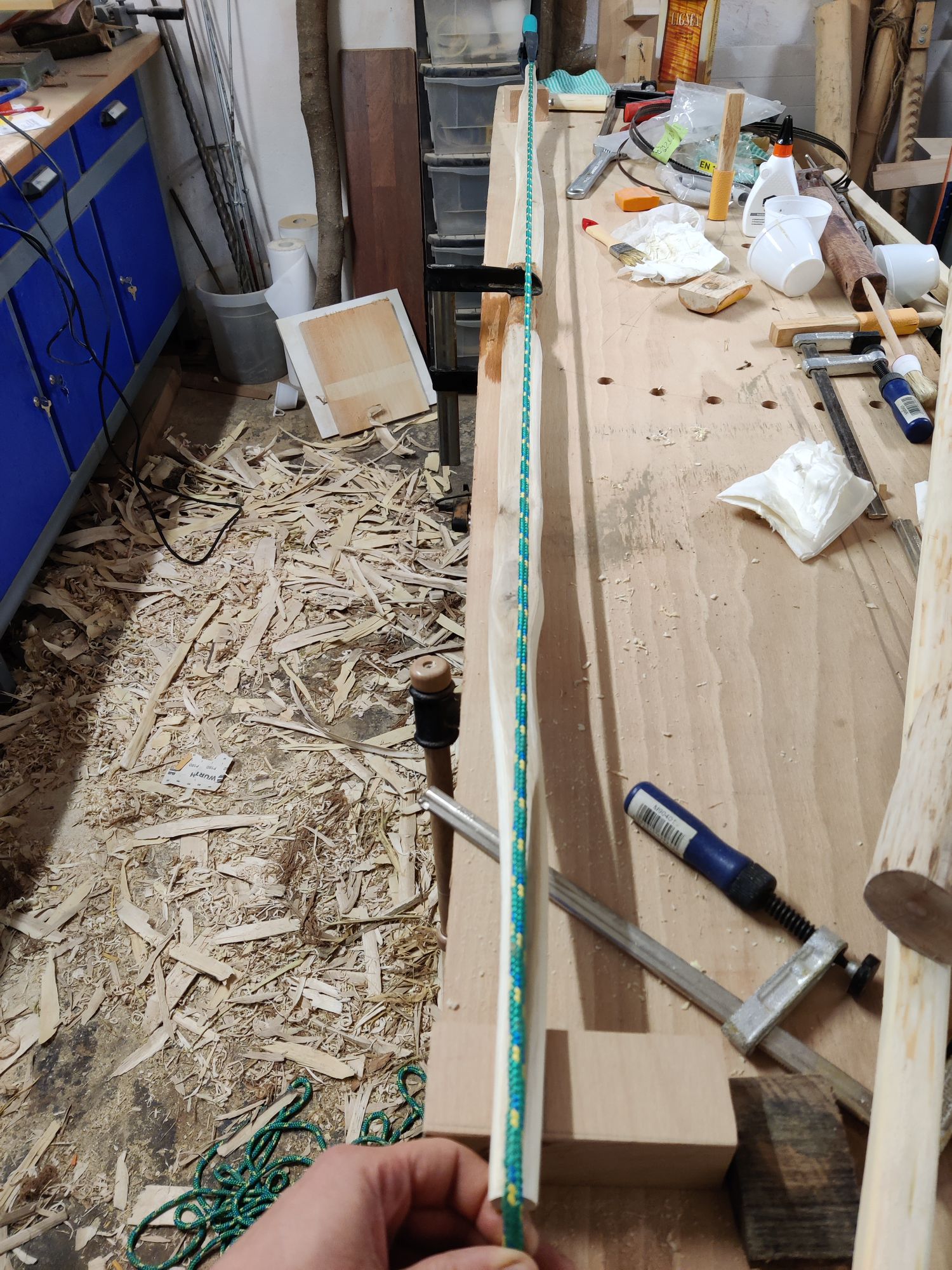 Die letzten Wochen war ich demotiviert an dem Sapling weiterzumachen weil ich ihn inzwischen als wenig erfolgversprechend Einstufe und mein Interesse nem anderen Bogen galt, aber heute gings dann doch mal weiter. Ich hab ihn heute an den Enden nochmal verschmälert und dann im Griff mit trockener Hitze und Tungöl gebogen. Dabei hab ich absichtlich überkorrigiert in Erwartung er würde etwas zurückkriechen. Dem war aber nicht so