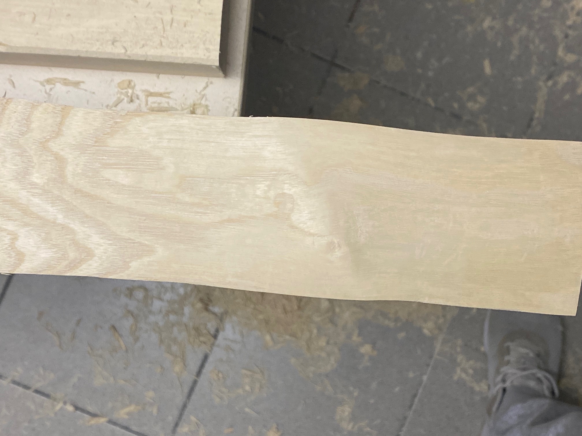 Ich wäre nun von der Mitte gegen das Ende vorgegangen und hätte Schicht um Schicht abgetragen; soweit ich das richtig sehe, macht das Holz an dieser Stelle einen Bogen nach oben (zum besseren Beurteilen müsste ich hier morgen wohl die Seite weiter schleifen)