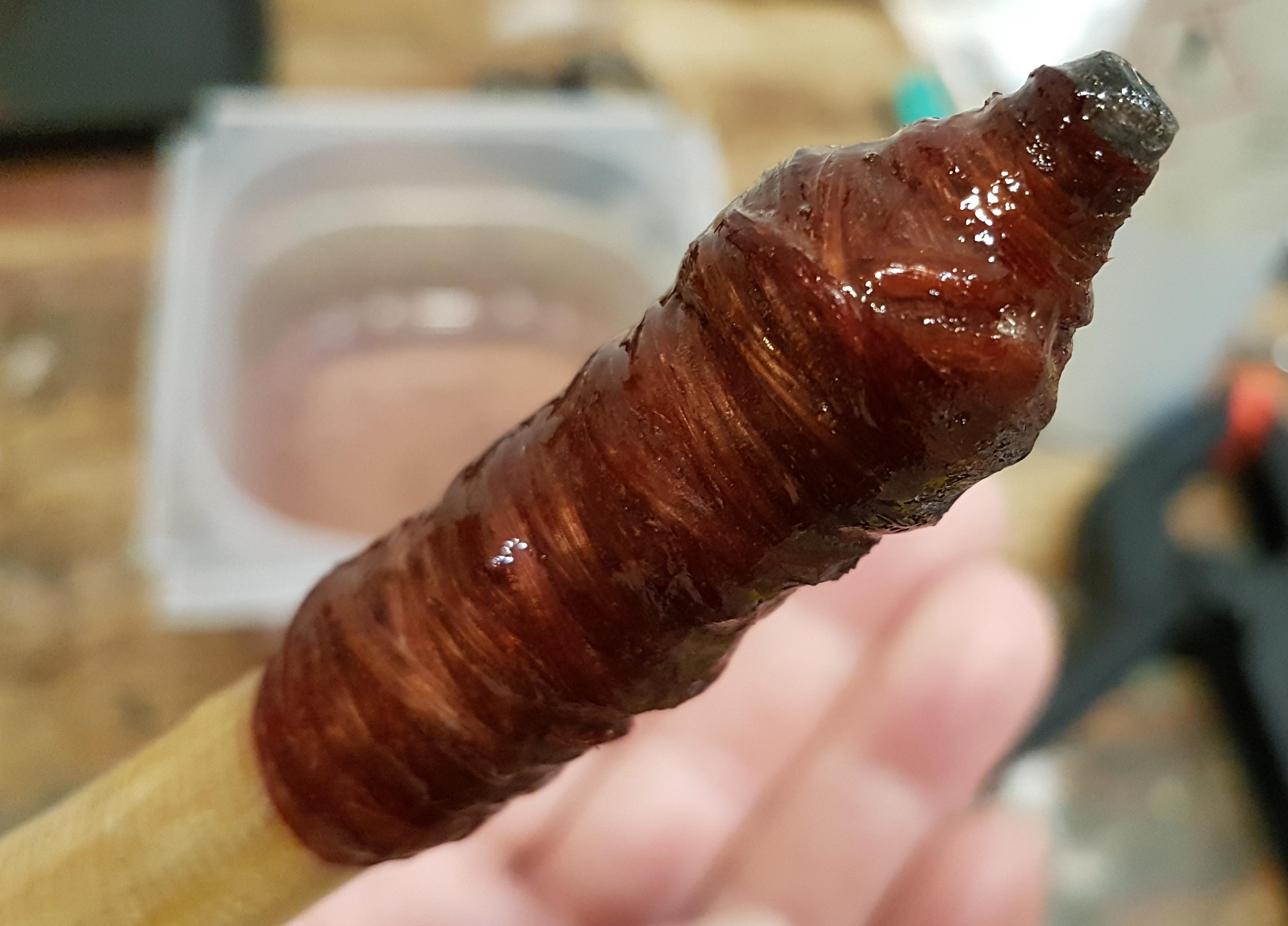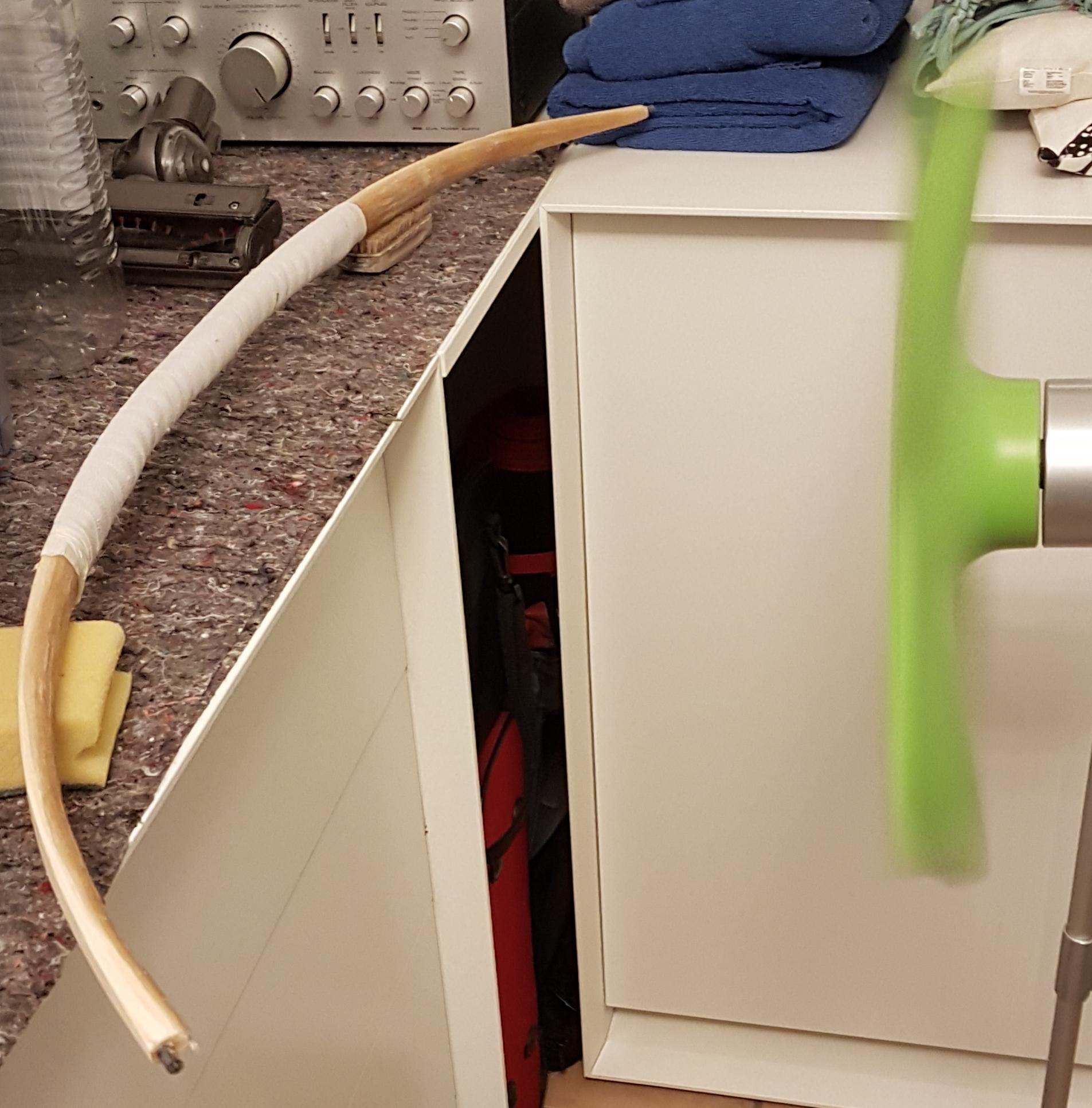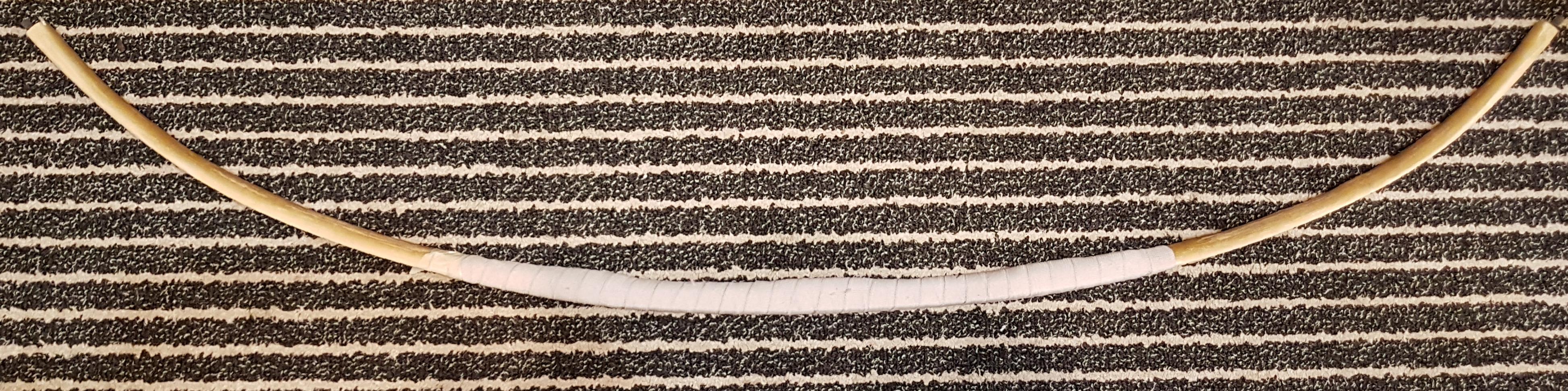Bogen 01 kurz: Heute wurden die mittleren 42 cm nachgearbeitet. Die Sehnenlage hate für meinen Geschmack zuviele Beule auf dem Rücken, deswegen wurden diese weggeschnitten und -geschliffen. Außerdem gab es an jedem WA in etwa an der gleichen Position eine 45 mm lange, deutlich dünnere Stelle als am Rest der Wurfarme. Für diese Stellen habe ich eine Rückensehne nur gehämmert und nicht zerfleddert und als Füllmasse aufgeklebt. Darüber kam dann eine finale Sehnenlage. Mehr Sehnen gibt es jetzt nicht mehr, die Zeit wird sonst zu knapp. Ich will dieses Jahr unbedingt schießbare Bogen in der vorgegebenen Zeit fertig bekommen.