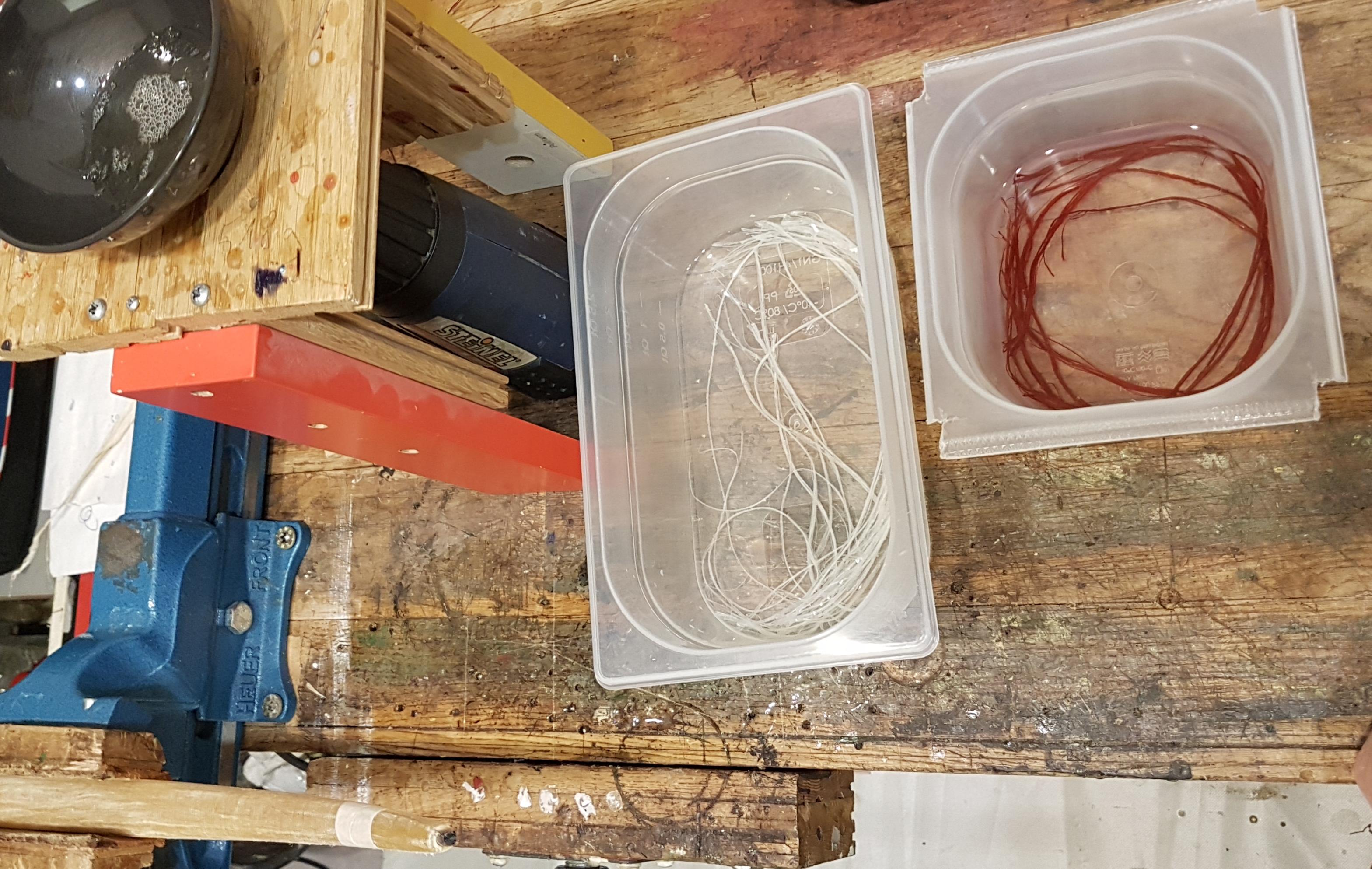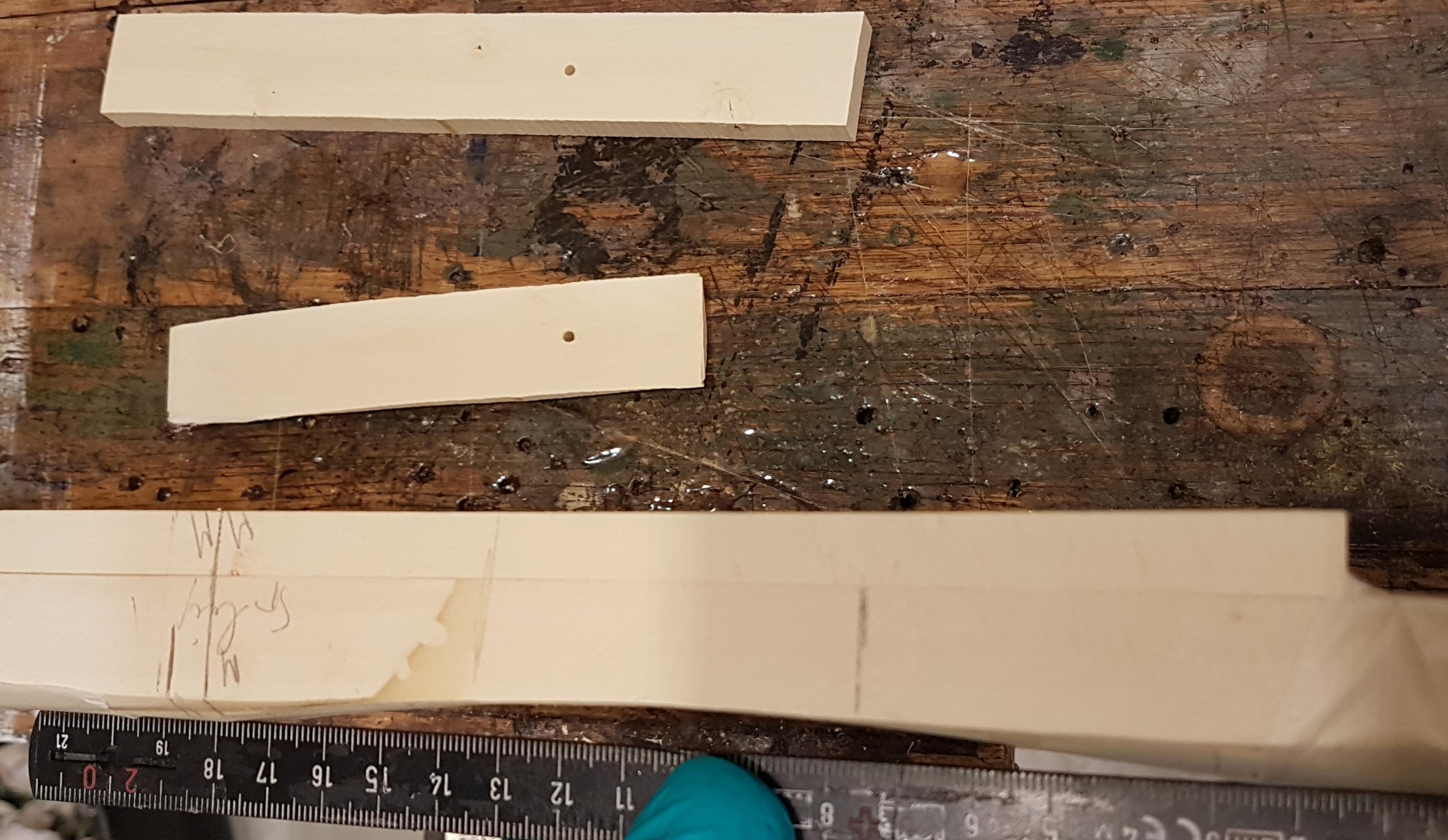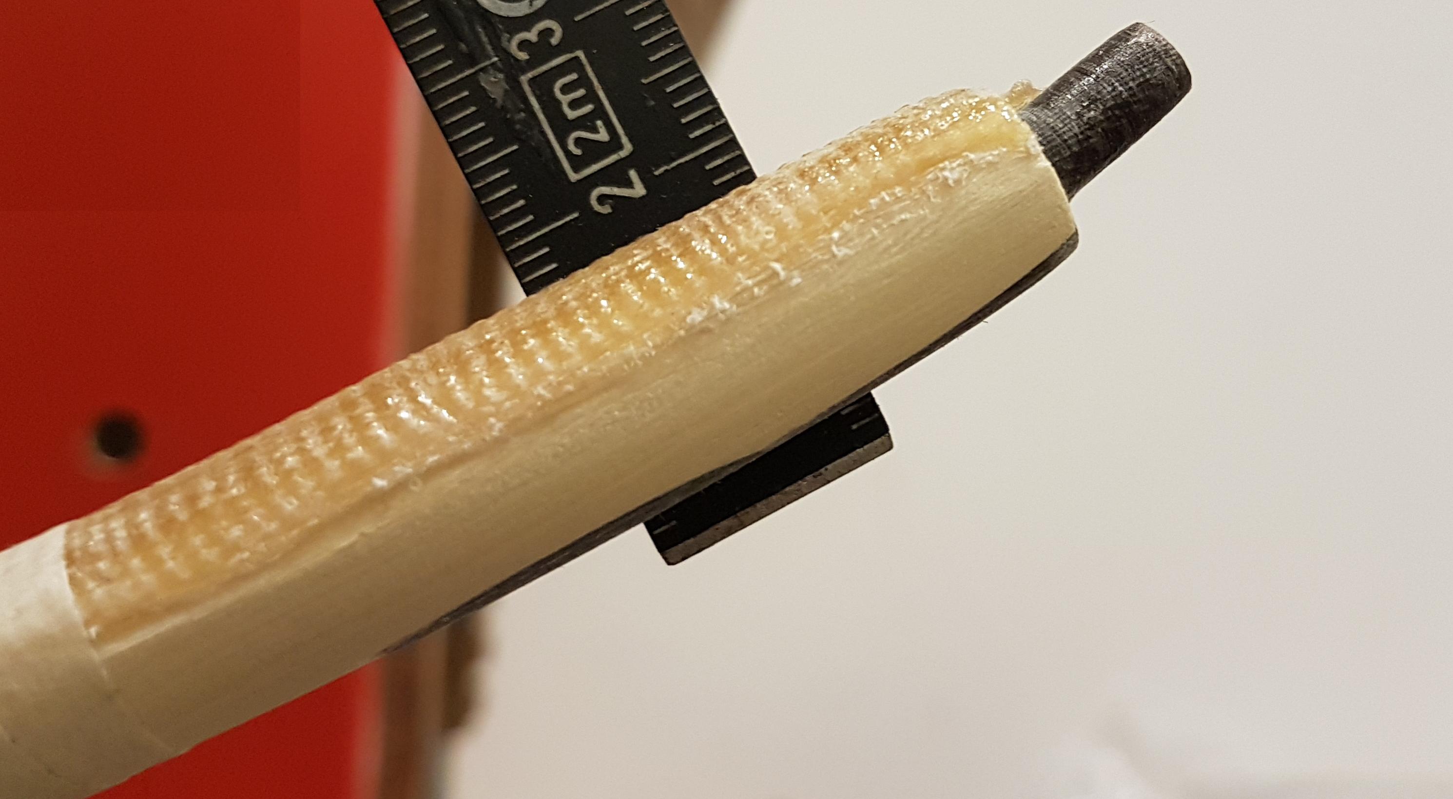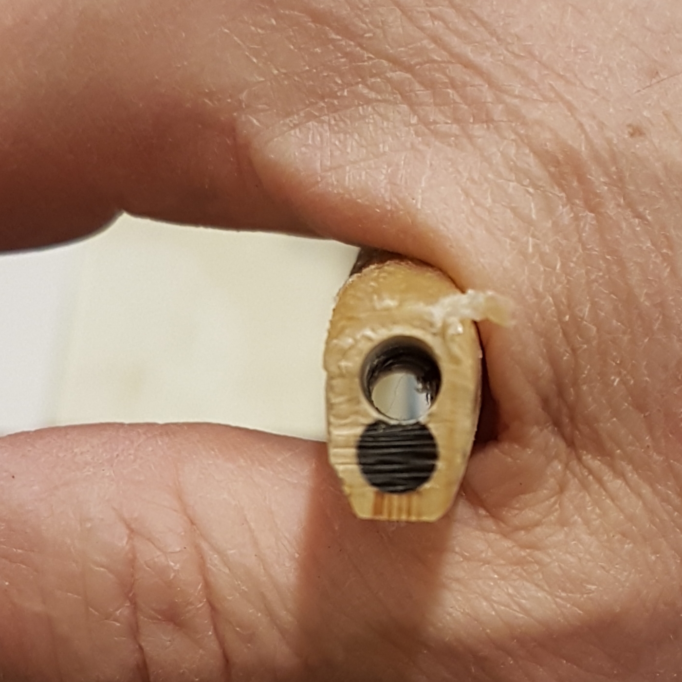Vorhin habe ich neue Horndübel geschnitten und geschliffen. Erst Stifte mit der Bandsäge geschnitten, dann per Hand annähernd rund geschliffen und final in den Akkuschrauber gespannt und rund auf Passung geschliffen.