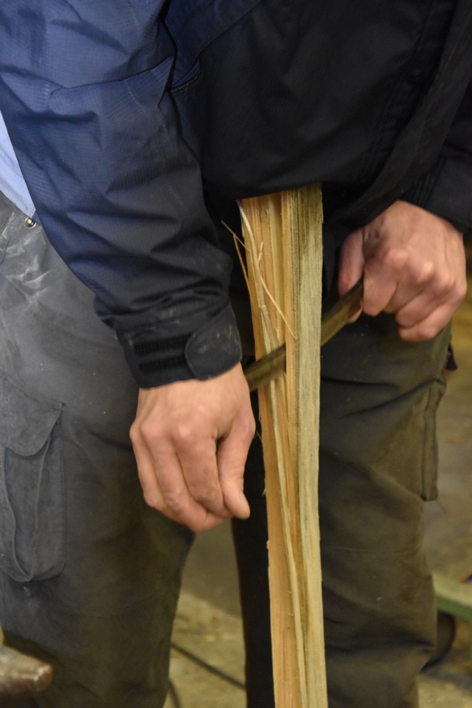 Ziel ist es die Pfeile aus Spaltlingen herzustellen deren Faserverlauf absolut parallel verläuft. Die Fichte und Kiefer wenn sie gerade Stellen hat eignet sich zum Spalten mit einfachen Werkzeugen sehr gut.