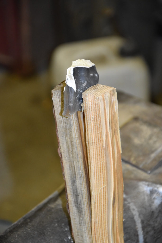 Da ich ja noch einen achten Schaft hatte, musste auch noch eine achte Spitze her. Ich habe den Schaft am vorderen Ende auf den gegenüberliegenden Seiten mit einem scharfen Messer mit einer Nut versehen (ca. 6-7 cm lang und 2 mm tief). In diese Nut habe ich kleine Feuersteinklingen bzw. -bruchstücke mittels Birkenteer eingeklebt und jeweils seitlich mit Birkenteer verfestigt. Vorne ist nur eine Holzspitze, die sich in den Silex-Messerchen nach hinten fortsetzt.