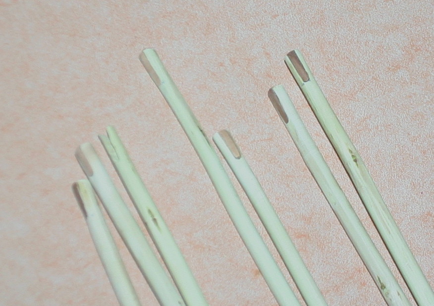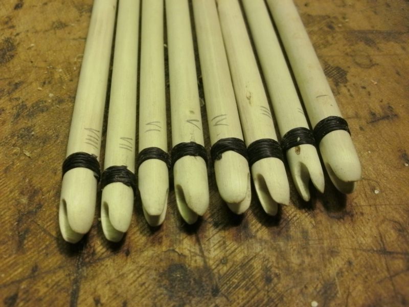 Die Schäfte haben nun eine Länge von 28,5 Zoll ohne Spitze. Mit dem Gewicht bin ich nicht so ganz auf eine einheitliche Linie gekommen. Die Gramm-Gewichte lagen bei den 7 Schäften bei 20/20/23/24/24/27/27 Gramm. Die Spinewerte der leichtesten 3 sind um die 20#, die restlichen 4 liegen bei gut 30#. Der Schaft mit den Messerchen ist etwas länger, er liegt bei einem Gewicht von 30 Gramm und einem Spine von knapp 30.