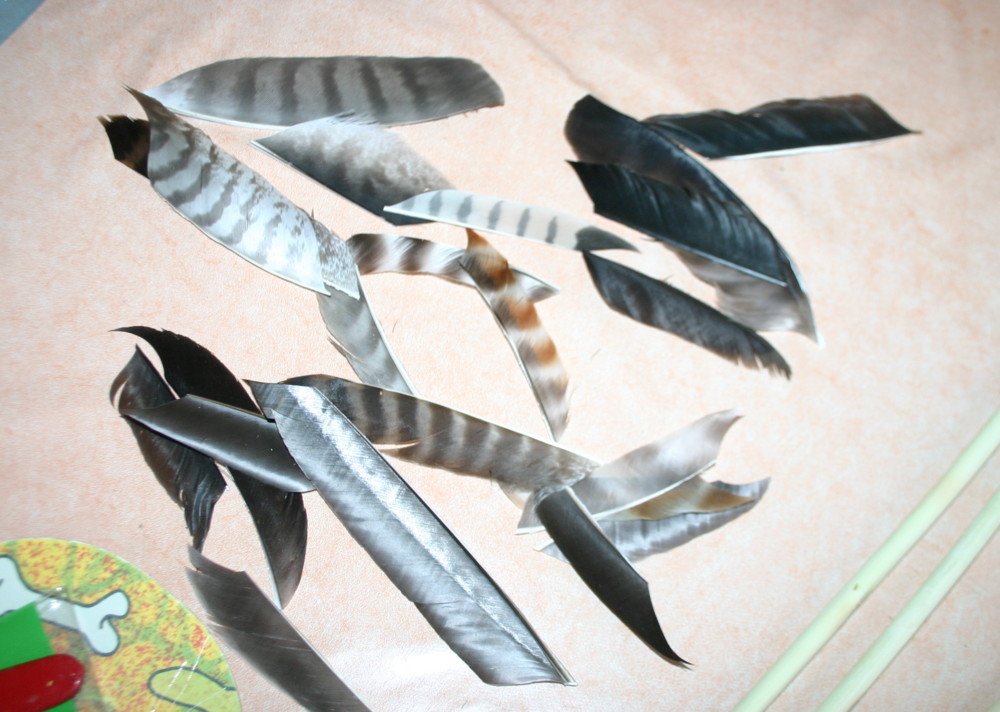 Nun war die große Frage der Befiederung. Mein Federvorrat war nicht mehr der beste und ich habe einfach mal alles zusammengesucht. Glücklicherweise habe ich doch noch ordentliche Federn gefunden, die auch für die beabsichtigten Pfeile reichen. Es handelt sich um ein Sammelsurium aus Bussard, Steinadler und Rabe.(die Rotbraunen sind noch von irgend einem anderen Viech :D )