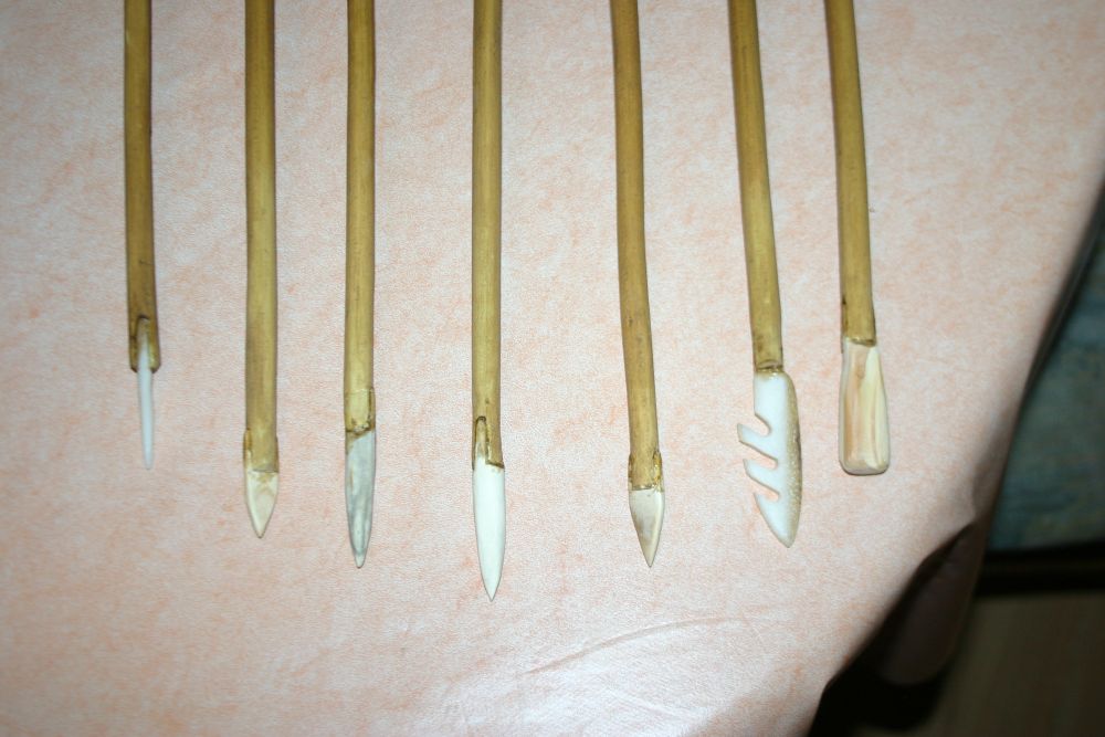 Nun waren die Spitzen dran. Ausgangsmaterial war folgendes vorhanden: Mammutelfenbein, Geweih von Reh und vom Hirsch und Hüftknochen vom Rind.